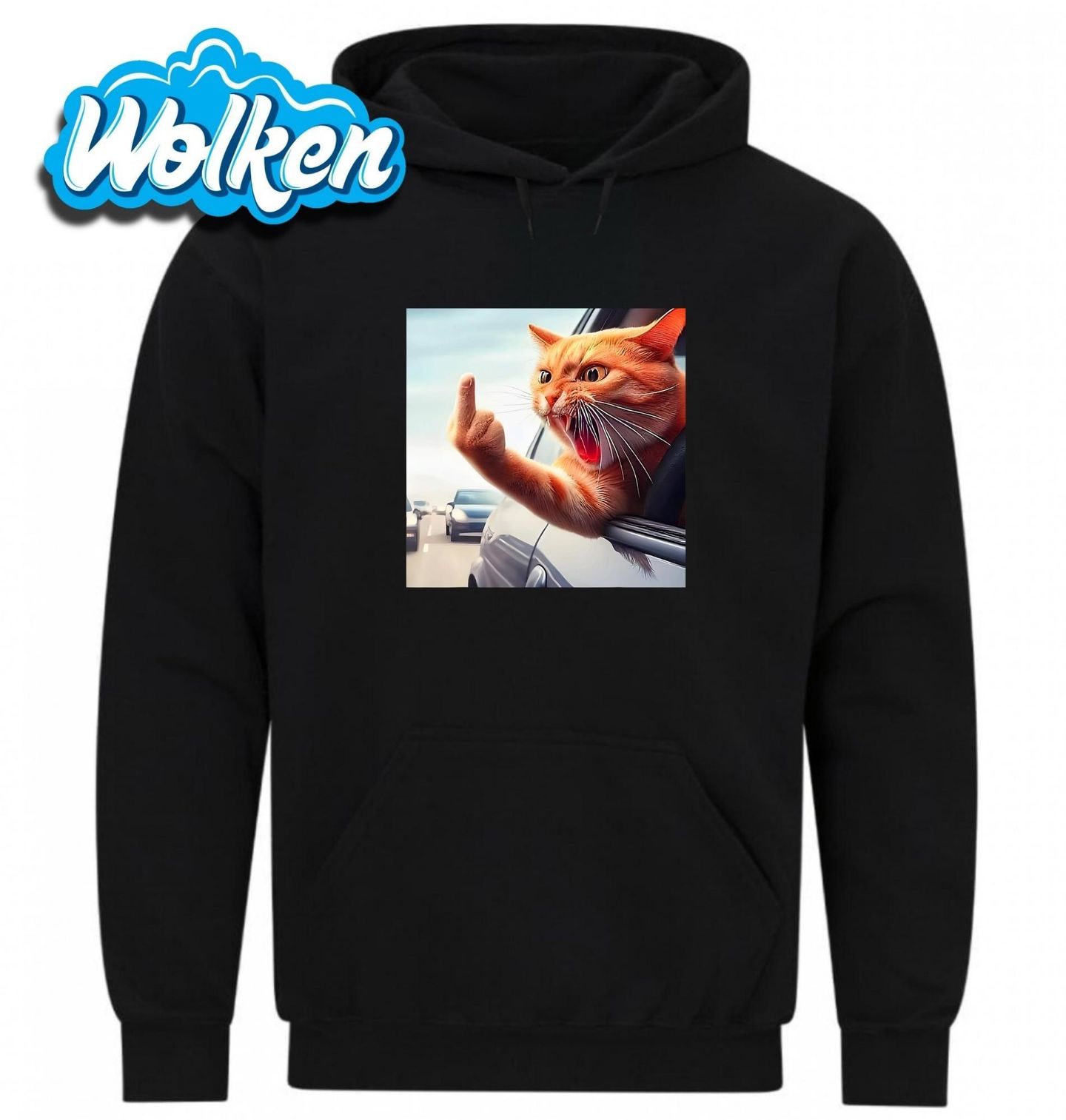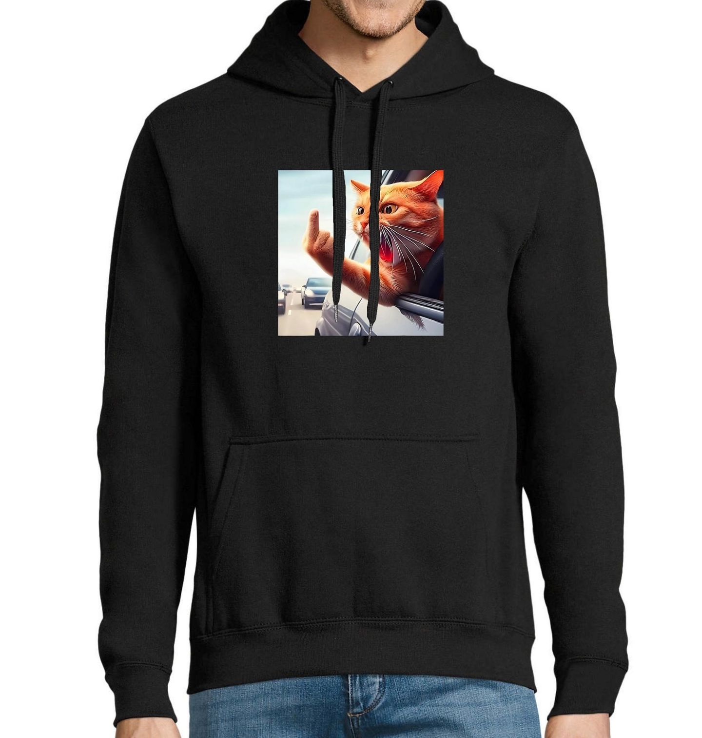 Pánská mikina Rozzuřená Kočka na Dálnici. Tahle kočka už má všeho dost. Sedí v autě, je naštvaná, a prostředníček jí rozhodně není cizí. Pokud tě štve doprava, lidé, nebo prostě pondělí – tenhle potisk ti bude rozumět líp než tvůj terapeut.