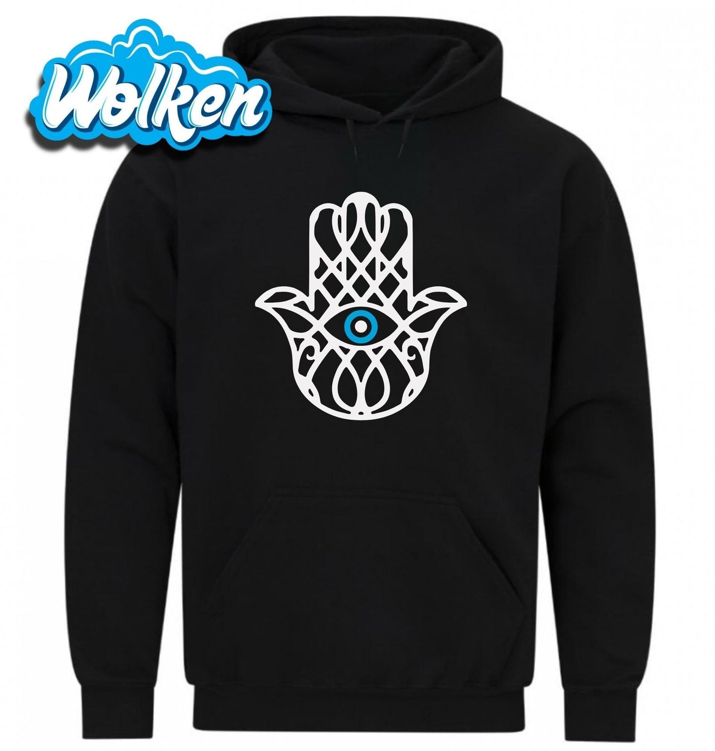 Pánská mikina Ruka Fátimy a Vševidoucí Oko. Hamsa nebo též „Fátimina ruka“ je starodávný symbol ochrany, štěstí a síly. Uprostřed je zobrazeno „vševidoucí oko“, které chrání před zlou energií a uhranutím. Symbol pochází z Blízkého východu a je oblíbený v různých kulturách jako amulet proti smůle.