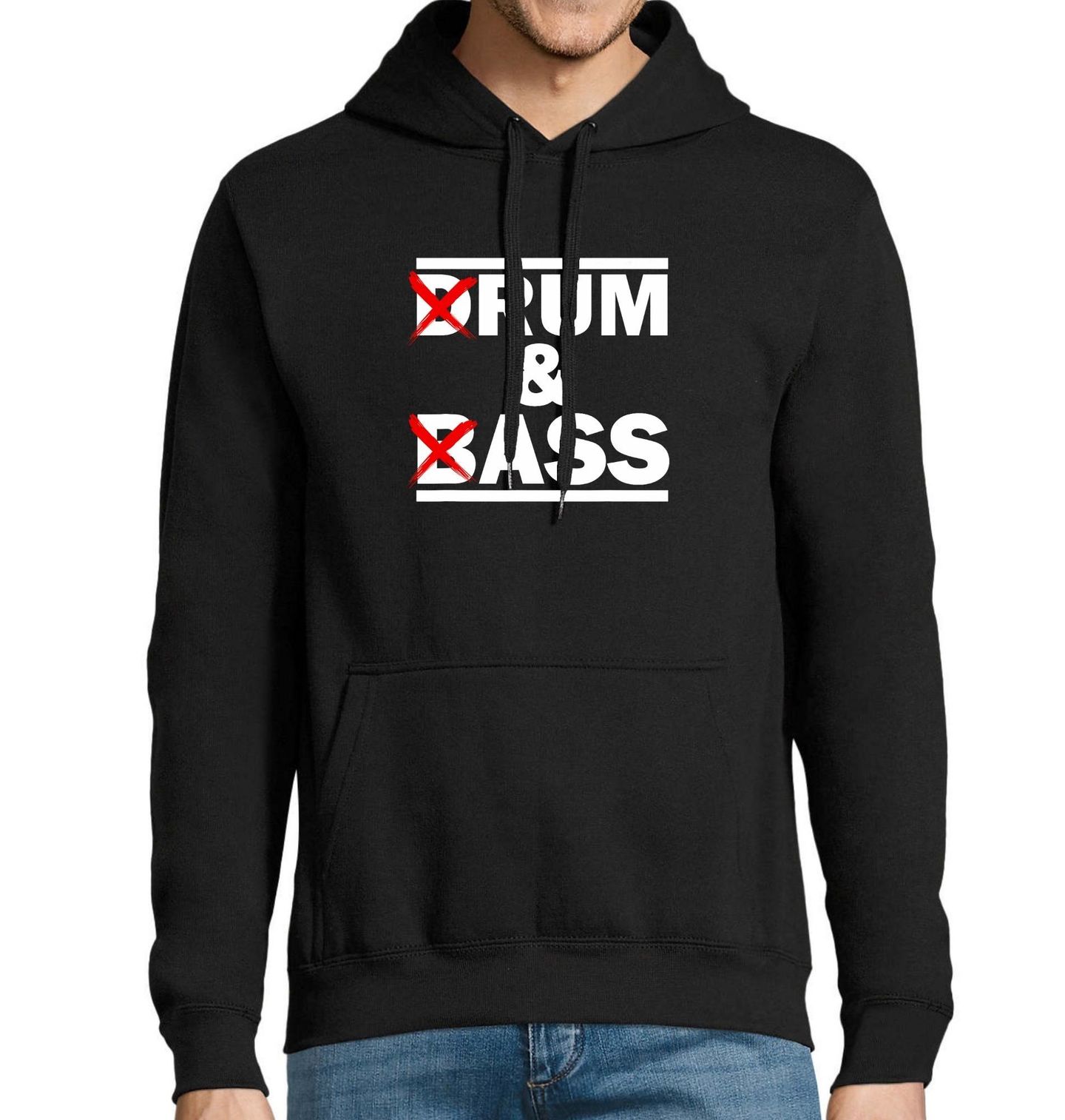 Pánská mikina Rum & Ass. Tento odlehčený a hravý motiv si dělá legraci z hudebního stylu Drum & Bass (Buben a basa). Díky přeškrtnutým písmenům se z nápisu stává výraz rum a zadek, což vytváří zábavnou a trochu provokativní slovní hříčku. Jednoduchý kontrastní design s červenými prvky na černém pozadí je výrazný a nepřehlédnutelný.