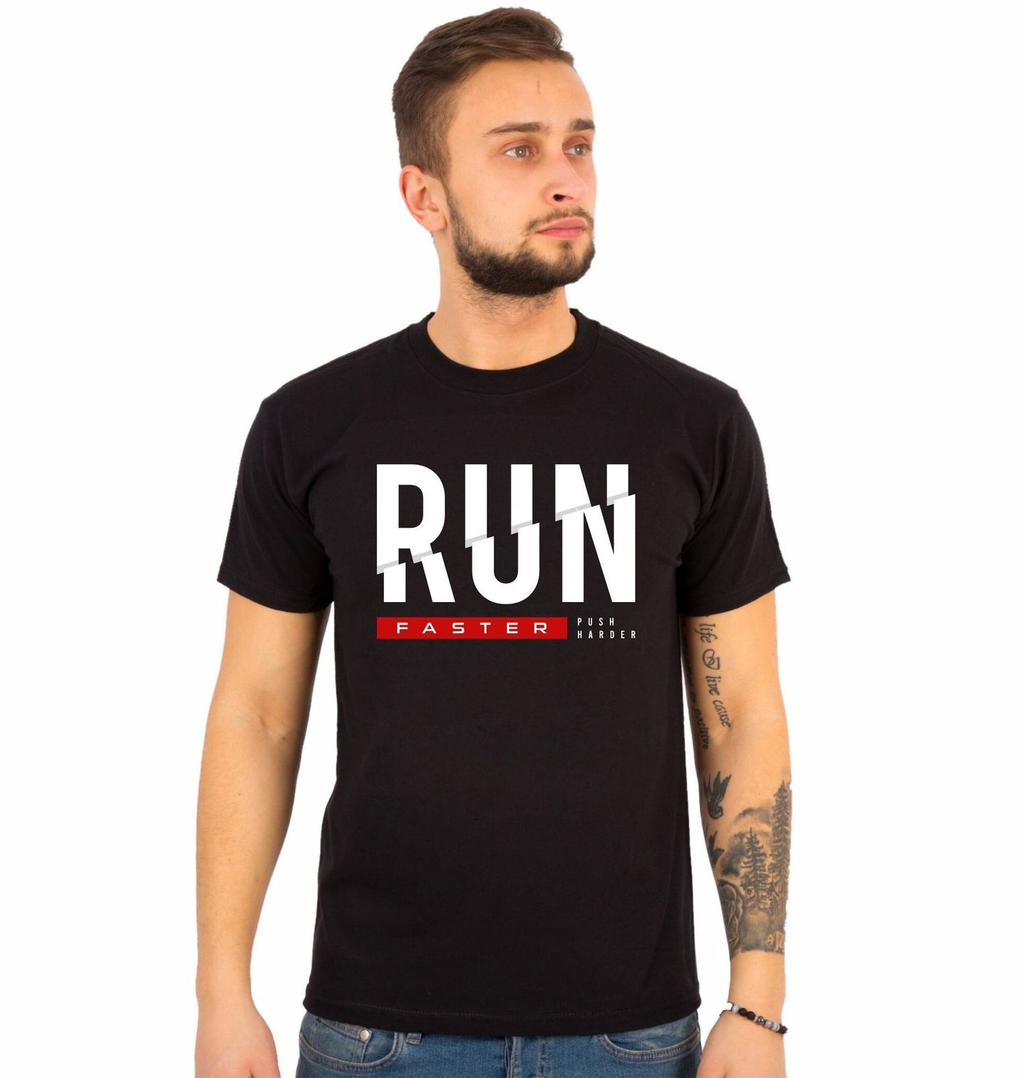 Pánské tričko Run Faster Push Harder. Minimalistický a dynamický motiv s nápisem RUN Faster je ideální pro každého, kdo bere běh a sport jako výzvu k neustálému zlepšování. Tento design osloví běžce, sportovce i všechny aktivní lidi, kteří se nebojí posouvat své hranice, zrychlovat tempo a tlačit na sebe víc, než je pohodlné.