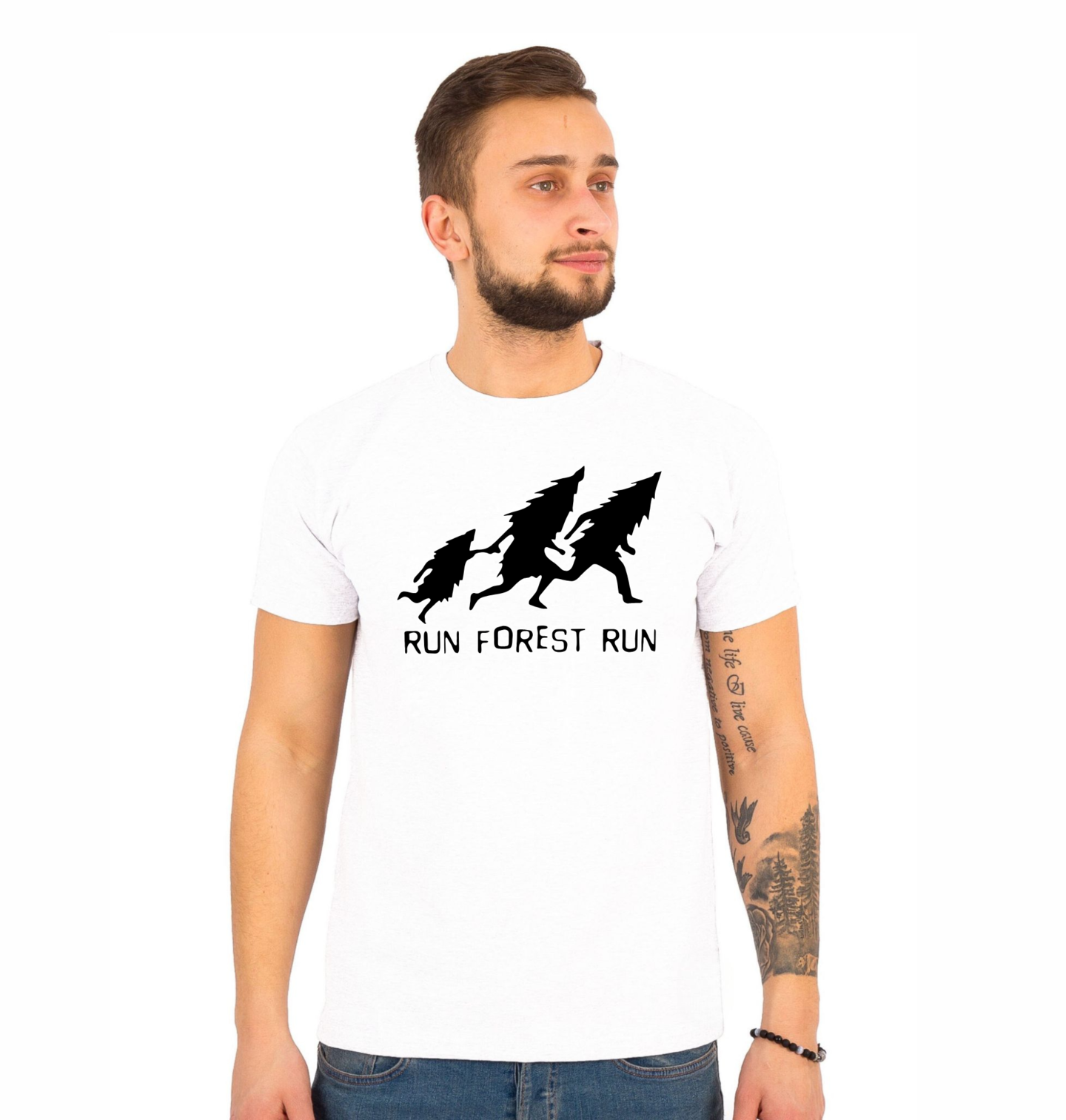 Pánské tričko Run Forrest Run. „Běžící les“ paroduje kultovní film Forrest Gump. Stejný význam slova Forest a Gumpova jména dala vzniku této komické parodii. Stejně jako Forrest, i stromy velmi rádi běhají. Pobav ostatní ikonickou parodií.