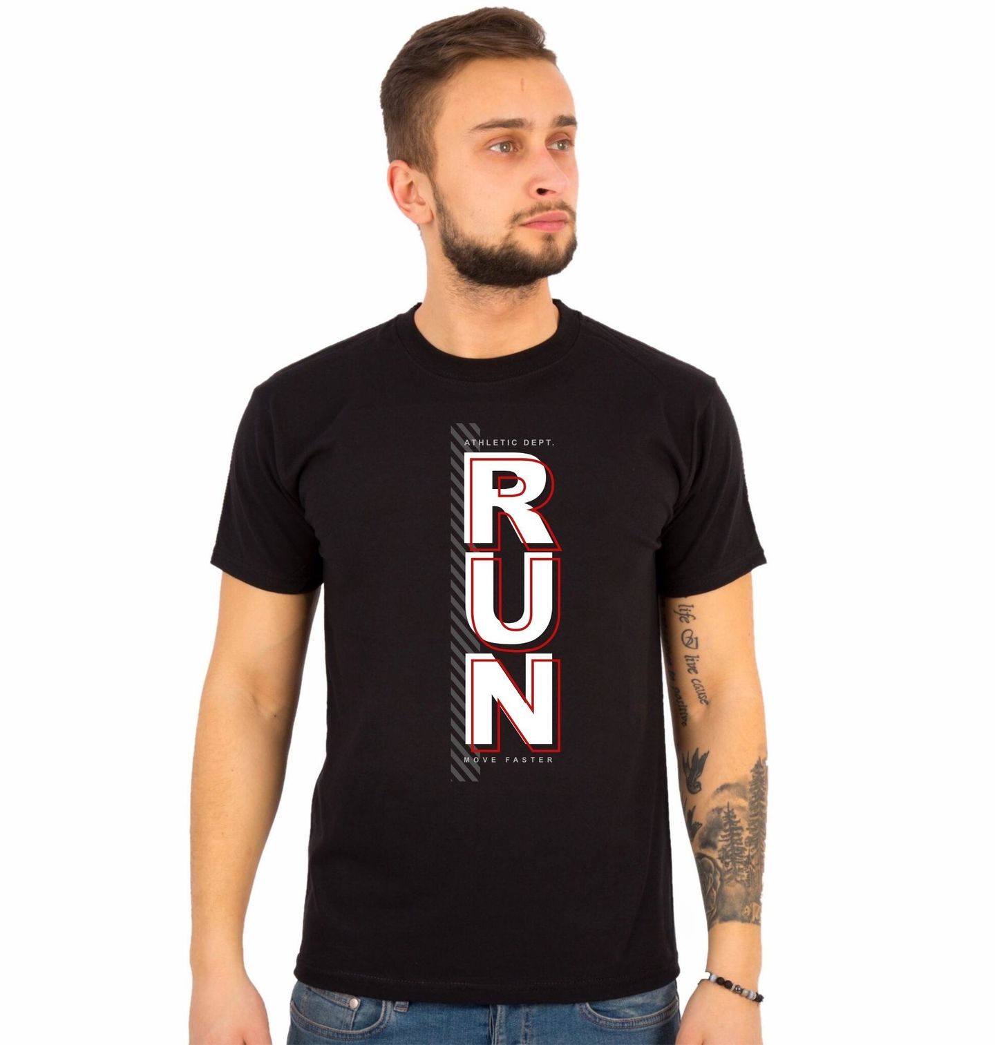 Pánské tričko RUN Move Faster. Výrazný sportovní motiv s vertikálním nápisem RUN je určen pro všechny, kteří berou běh jako přirozenou součást aktivního života. Design je ideální pro běžce, atlety i fanoušky moderního sportovního stylu, kteří chtějí dát jasně najevo svou vášeň pro výkon, tempo a posun vpřed. Skvěle se hodí na trénink, závody i každodenní nošení.