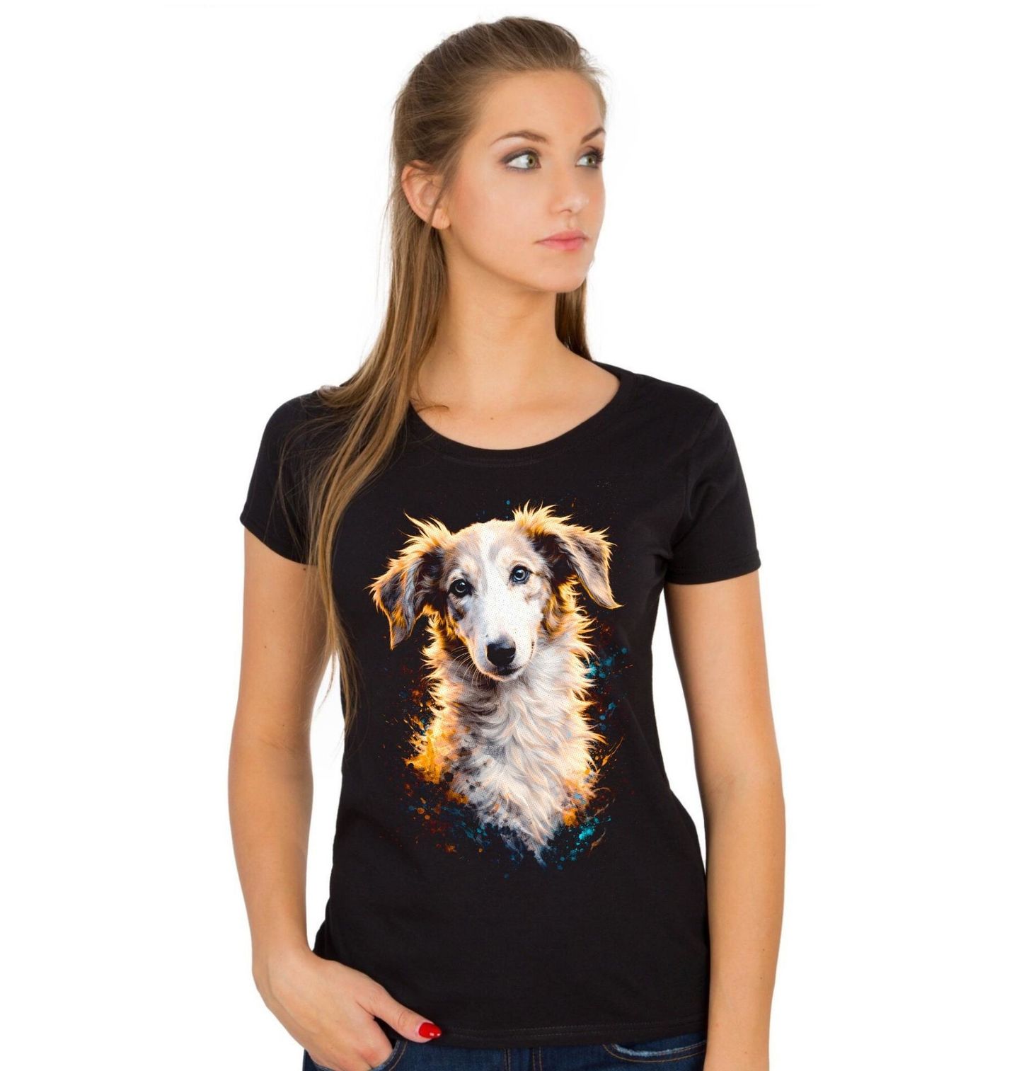 Dámské tričko Ruský chrt Barzoj. Tento pes je symbolem rychlosti, elegance a aristokratické krásy, která zaujme na první pohled. Barzoj je klidný, inteligentní a velmi citlivý pes, který si zachovává důstojnost i jemnost. Pro každého pejskař představuje toto plemeno jedinečné spojení elegance, ladnosti a nezávislé povahy. Tento pes byl historicky využíván k lovu a dodnes si zachovává svou rychlost a grácii.
