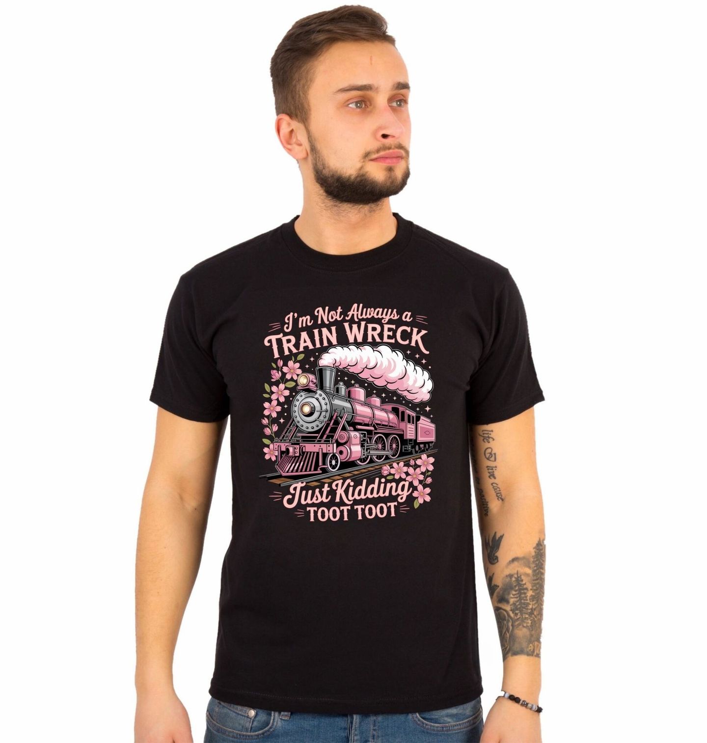 Pánské tričko Růžová Parní Lokomotiva Toot Toot. „I’m Not Always a Train Wreck“ = „Nejsem vždycky vlaková katastrofa“. „Just Kidding“ = „Dělám si legraci“. Originální design s motivem, kde hraje hlavní roli vlak a stylová parní lokomotiva v jemných růžových barvách, zaujme každého milovníka železnice i humoru.