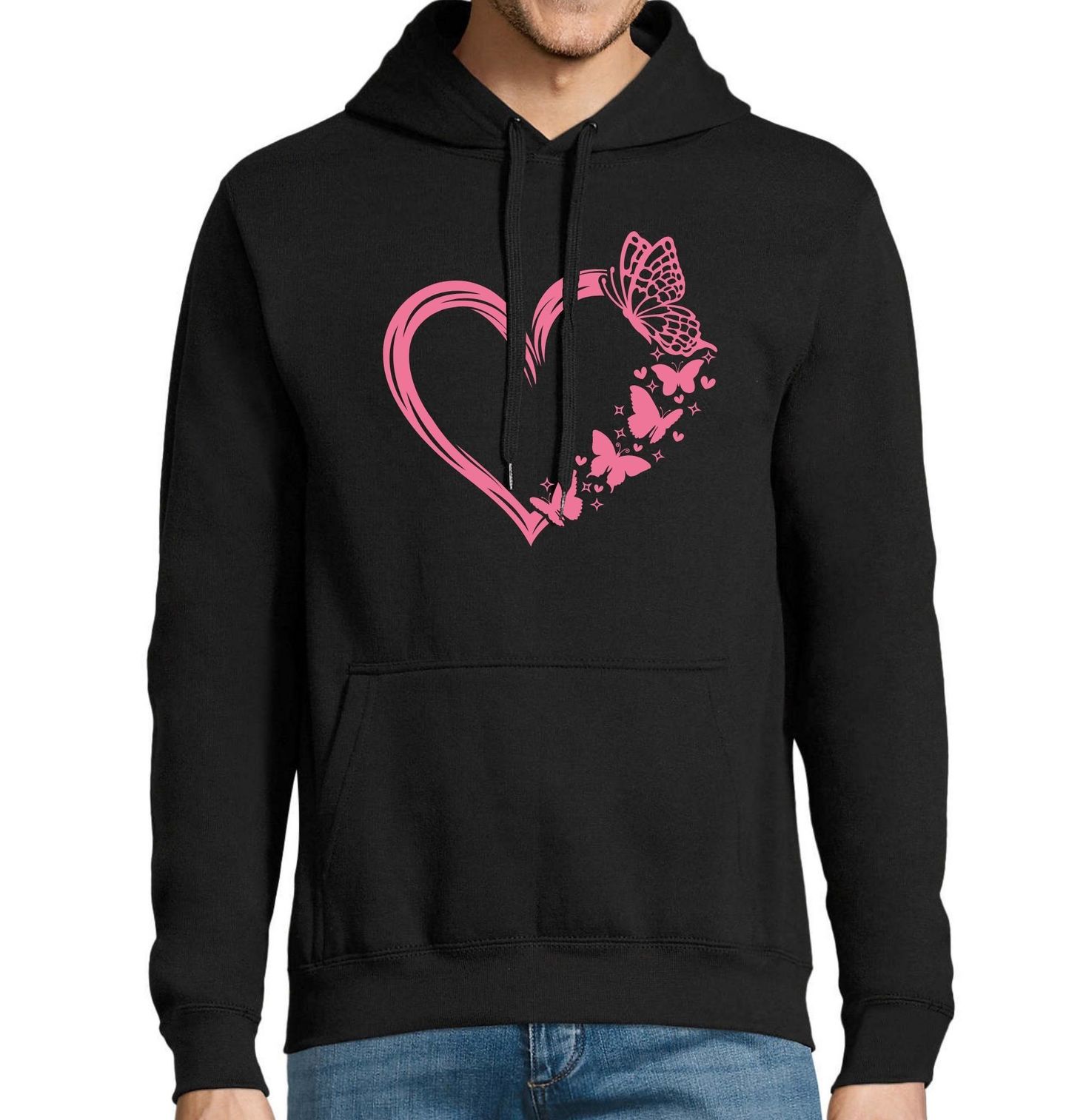 Pánská mikina Růžové Motýlí srdce. Elegantní design spojuje motiv srdce a motýlů v harmonické růžové kompozici plné něhy a lehkosti. V srdci z motýlích křídel poletují stylizované motýly v jemných křivkách, doplněné malými srdíčky a hvězdami. Motýl jako volnost, srdce jako cit a láska největší síly života.