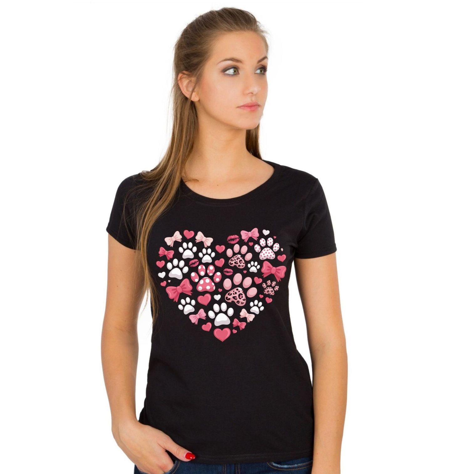 Dámské tričko Růžové Srdce Pejskaře. Roztomilý design ve tvaru srdce složeného z různých tlapky, mašliček a malých srdíček potěší každého, kdo miluje pes a chce svůj styl doplnit něžným motivem. Tento hravý vzor je ideální volba pro každého, kdo je hrdý pejskař a rád ukazuje lásku ke svému čtyřnohému parťákovi. Jemné růžové barvy a stylové tlapky vytvářejí moderní a veselý vzhled vhodný na každodenní nošení i jako originální dárek pro milovníky psů.