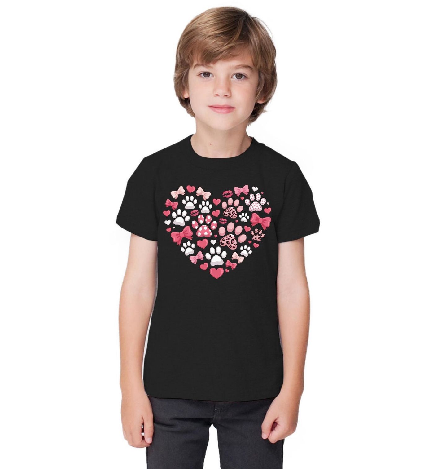 Dětské tričko Růžové Srdce Pejskaře. Roztomilý design ve tvaru srdce složeného z různých tlapky, mašliček a malých srdíček potěší každého, kdo miluje pes a chce svůj styl doplnit něžným motivem. Tento hravý vzor je ideální volba pro každého, kdo je hrdý pejskař a rád ukazuje lásku ke svému čtyřnohému parťákovi. Jemné růžové barvy a stylové tlapky vytvářejí moderní a veselý vzhled vhodný na každodenní nošení i jako originální dárek pro milovníky psů.
