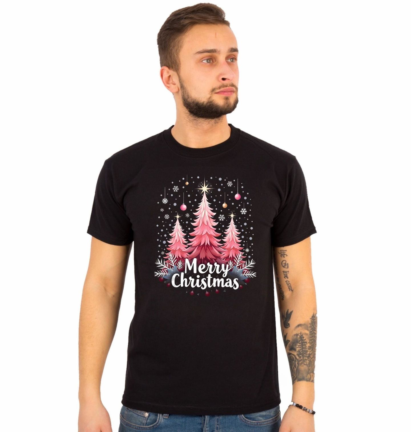 Pánské tričko Růžové Vánoce Merry Christmas. Tento design zachycuje tři nádherné růžové vánoční stromy ozdobené hvězdami, baňkami a vločkami, které symbolizují tu pravou sváteční atmosféru. Ideální pro všechny, kdo chtějí oslavit Vánoce s trochou netradiční krásy a stylu.
