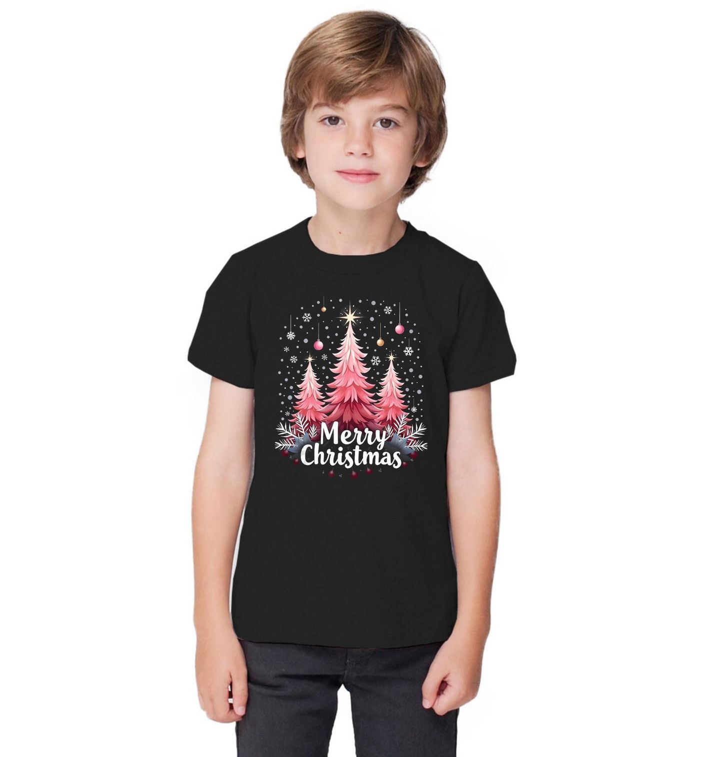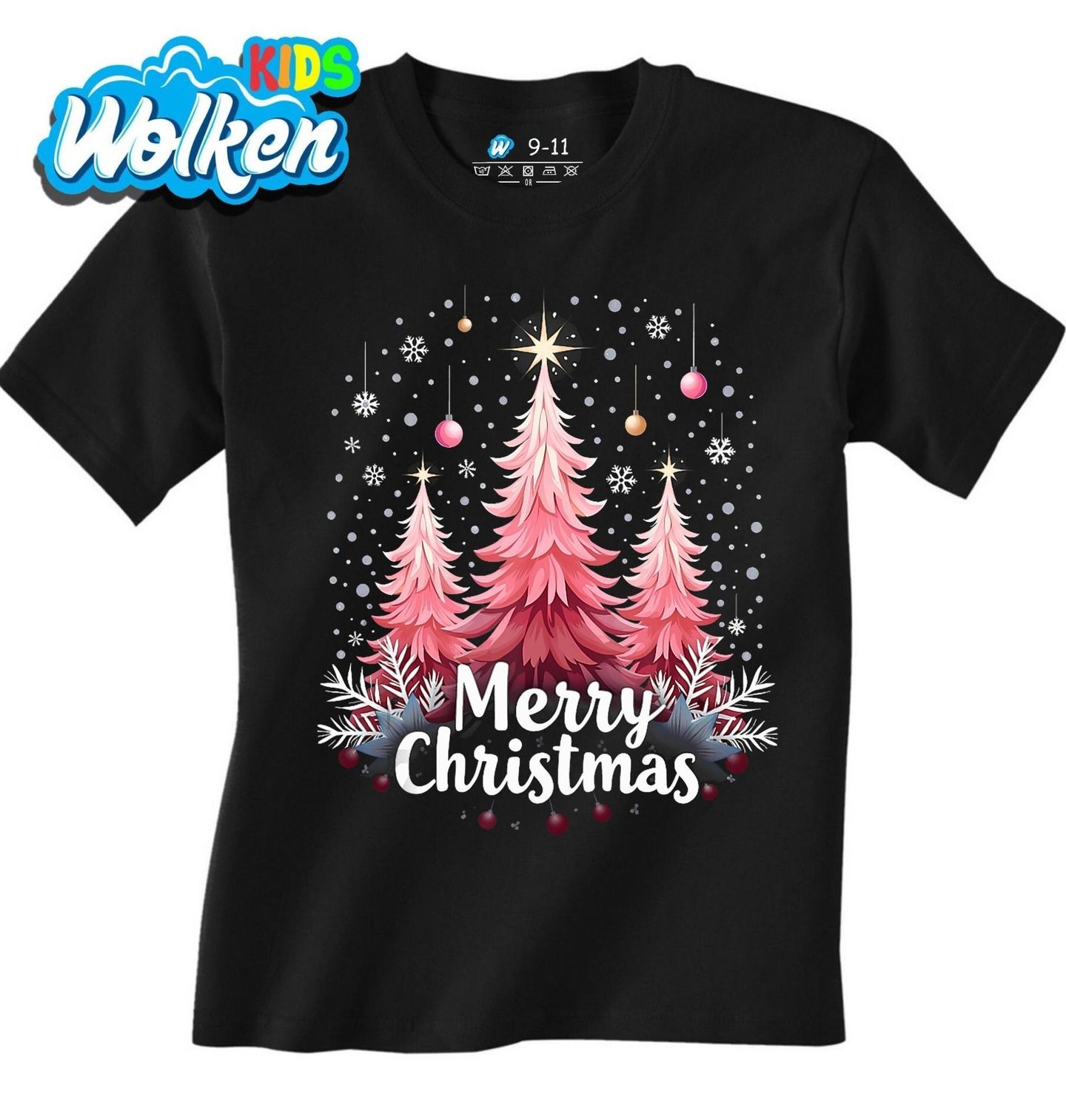 Dětské tričko Růžové Vánoce Merry Christmas. Tento design zachycuje tři nádherné růžové vánoční stromy ozdobené hvězdami, baňkami a vločkami, které symbolizují tu pravou sváteční atmosféru. Ideální pro všechny, kdo chtějí oslavit Vánoce s trochou netradiční krásy a stylu.