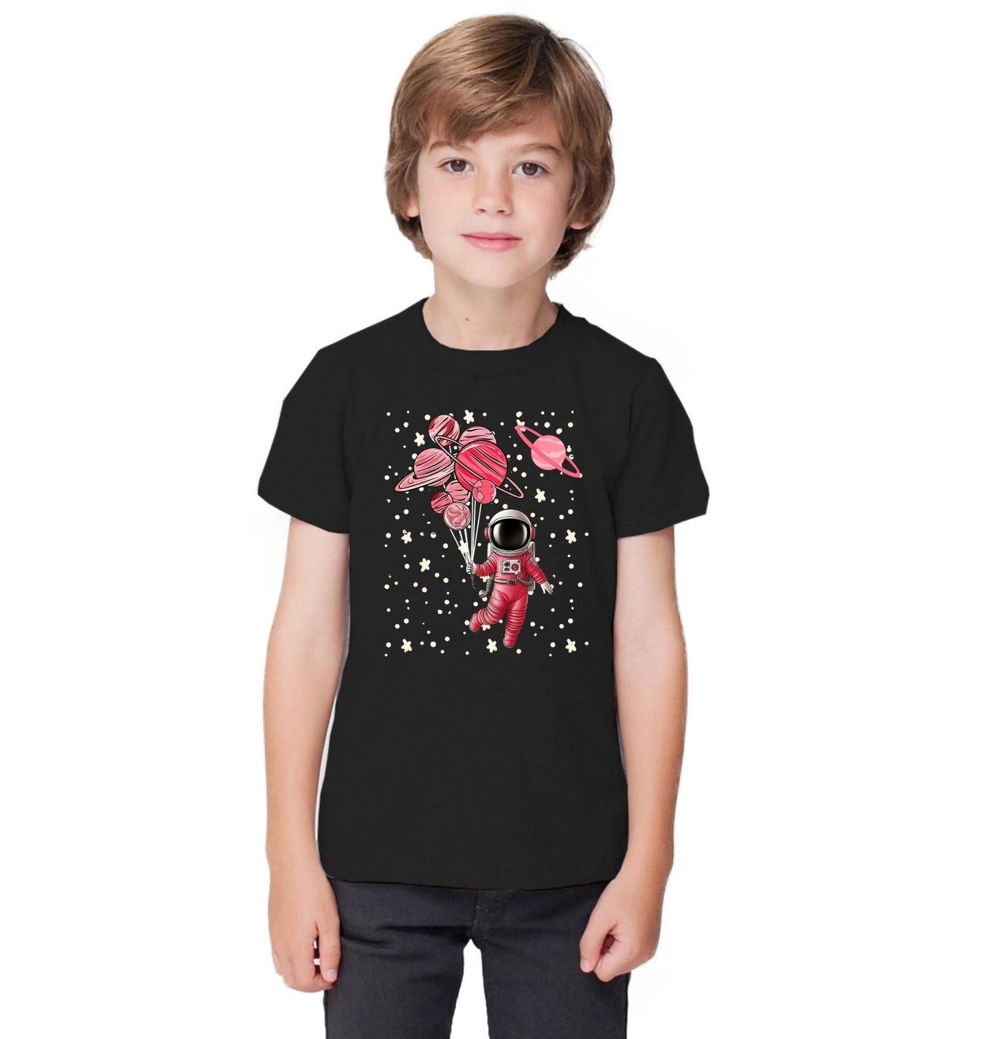 Dětské tričko Růžový Astronaut na Cestě Vesmírem. Originální ilustrace, která zaujme na první pohled – astronaut, v elegantní červené skafandru, se vznáší vesmírem, unášen balonky ve tvaru barevných planet. Tento design spojuje fantazii, svobodu a touhu po objevování.