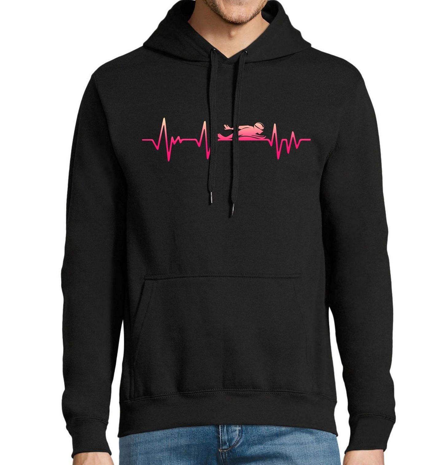 Pánská mikina Růžový Kardiogram Plavce Motýlek. Moderní sportovní motiv propojuje kardiogram se siluetou plavce v motýlkovém stylu a symbolizuje vášeň pro plavání i rytmus srdce při výkonu. Design znázorňuje energii, sílu a soustředění, které jsou s tímto náročným stylem neodmyslitelně spojené.