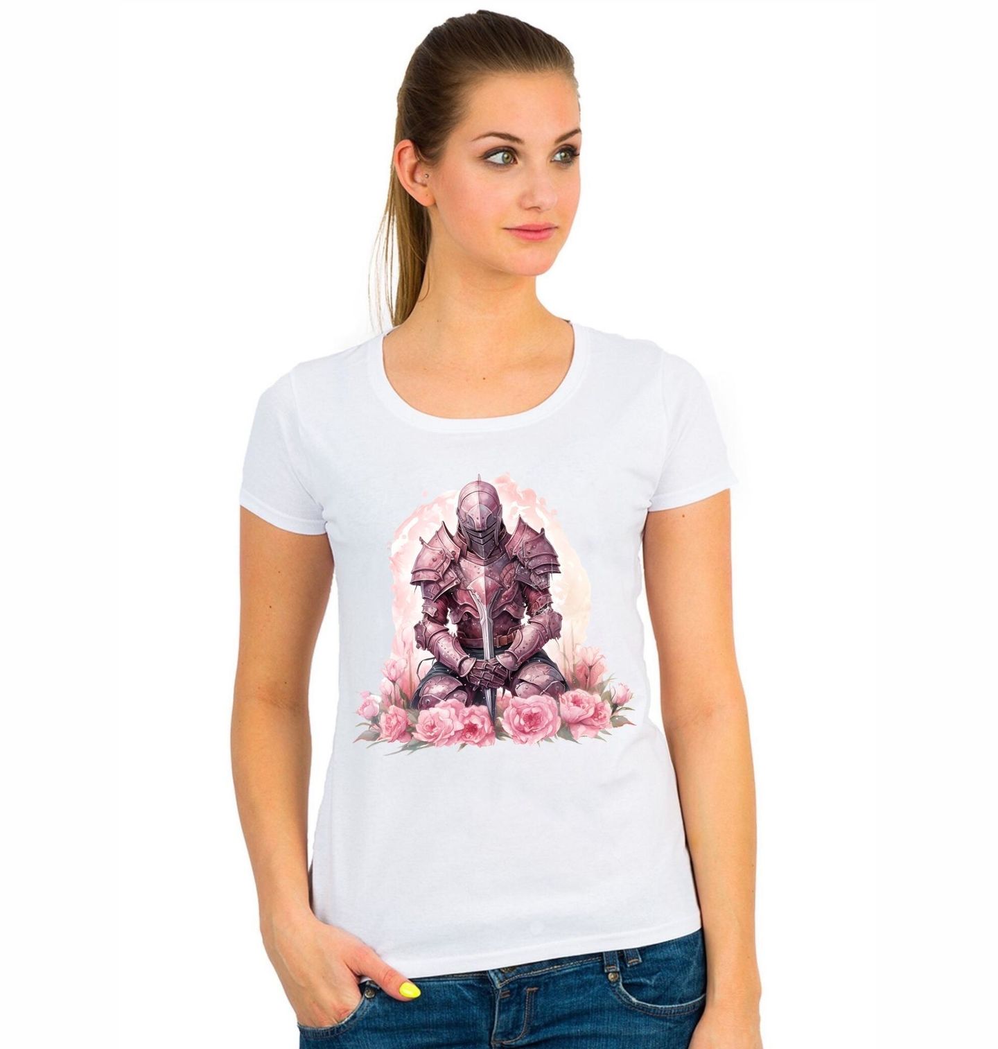 Dámské tričko Růžový Rytíř. Elegantní rytíř v růžovém brnění osetý květinami. Kontrast síly a něhy vytváří působivý vizuál, kde rytíř symbolizuje odvahu a čest, zatímco růže dodává celému designu romantický a umělecký nádech.