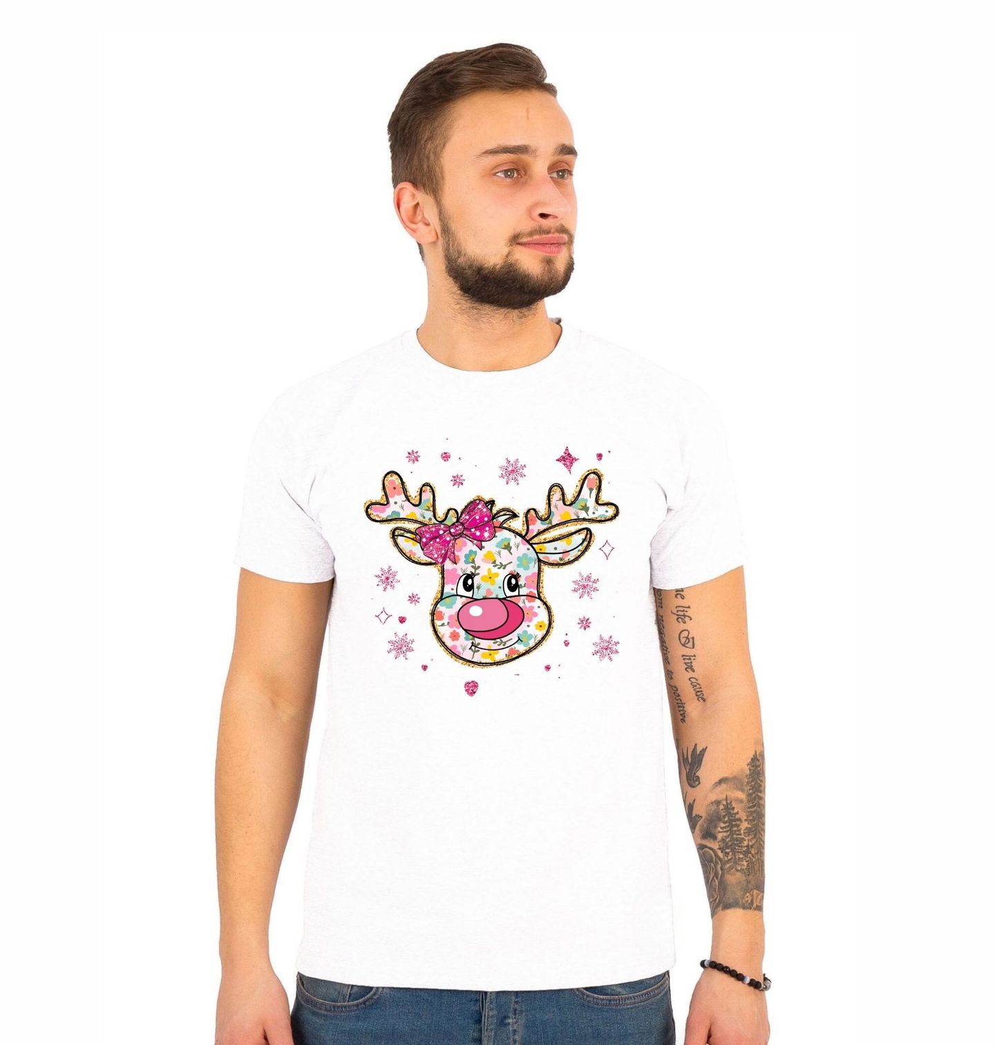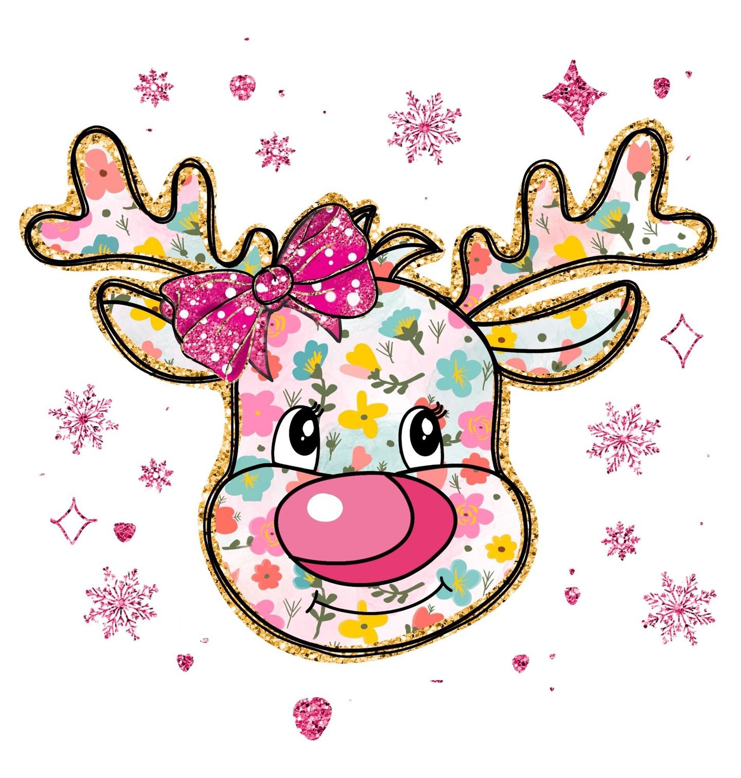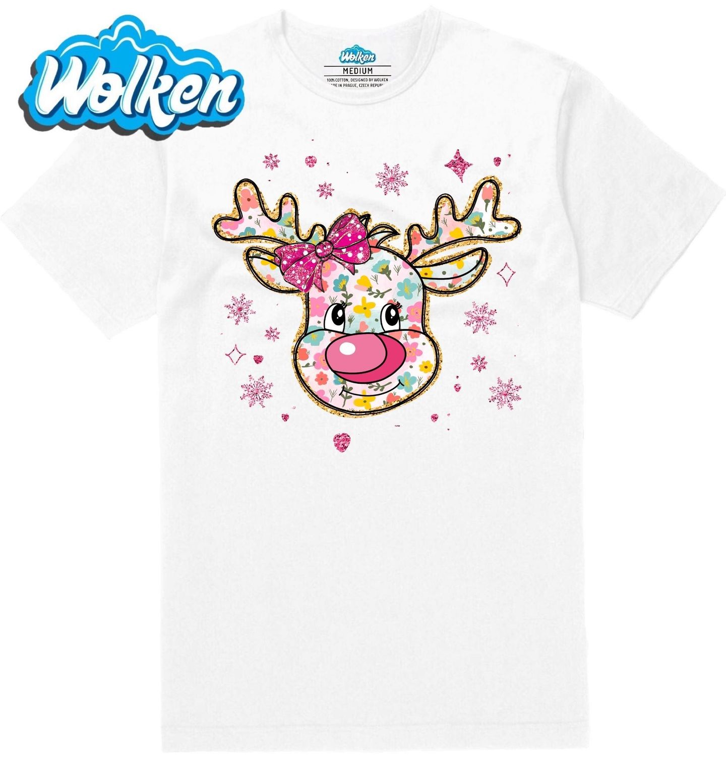 Pánské tričko Růžový Vánoční Sob. Veselý a roztomilý motiv soba s růžovým nosem, který je celý ozdobený květinovým vzorem a třpytivými detaily. Tato barevná ilustrace přináší hravou a něžnou atmosféru, ideální pro ty, kteří chtějí prožít Vánoce v originálním a roztomilém stylu.