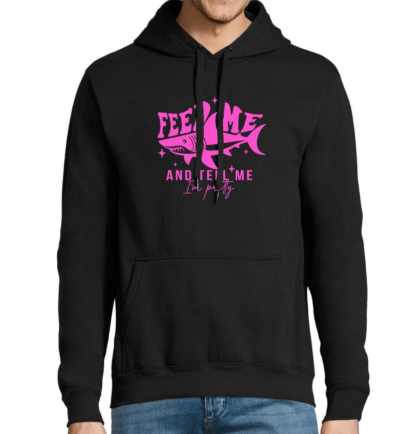 Pánská mikina Růžový žralok Nakrm mě a řekni, že jsem hezká. Tento motiv je humornou parodií na klasické hlášky o vztazích a „basic“ požadavcích („Feed Me and Tell Me I'm Pretty“), často spojované s internetovými memy a popovou kulturou. Místo roztomilé dívky ale nastupuje žralok – což přidává komický kontrast mezi nebezpečím a něžností.