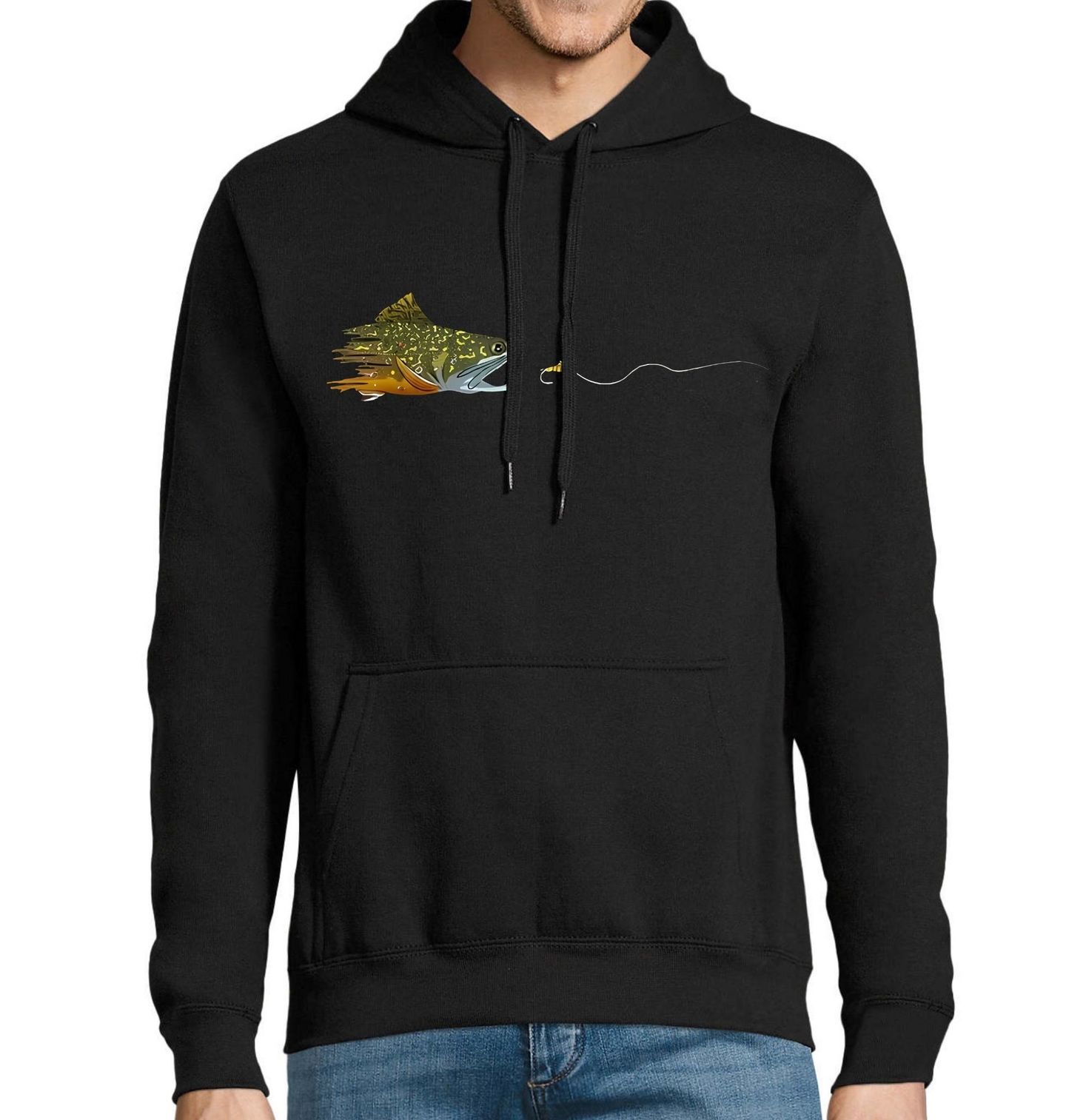 Pánská mikina Ryba a Háček. Minimalistický design zobrazující rybu těsně před zakousnutím do návnady na háčku. Jednoduché, ale výstižné provedení zachycuje napětí okamžiku těsně před úlovkem. Ideální pro milovníky rybaření, kteří oceňují čistý design a symboliku svého oblíbeného koníčku.