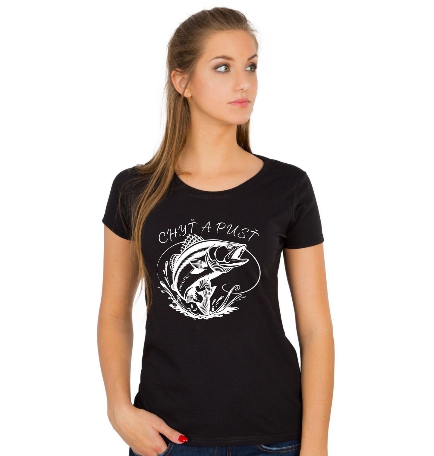 Dámské tričko Ryba na Háčku Chyť a pusť. Originální design „Chyť a pusť“ pro všechny, kdo milují vodu, klid u prutů a sportovní rybaření. Dominantou motivu je dravá ryba ve stylu black bass (okounovec velkoústý) zachycená v dynamickém skoku z vody. Perfektní dárek pro každého, kdo je hrdý rybář a ctí etiku „catch & release“.