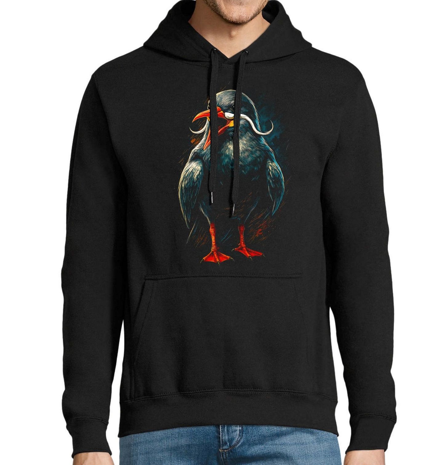 Pánská mikina Rybák inka. Originální motiv zachycuje výrazného ptáka inspirovaného druhem rybák inka, který je známý svými typickými bílými „kníry“ a sytě červeným zobákem. Tento exotický pták pochází z pobřeží Jižní Ameriky a patří mezi nejzajímavější mořské druhy. Rybák inka zaujme nejen svým vzhledem, ale také energickým a lehce komickým výrazem, díky kterému je design nepřehlédnutelný.