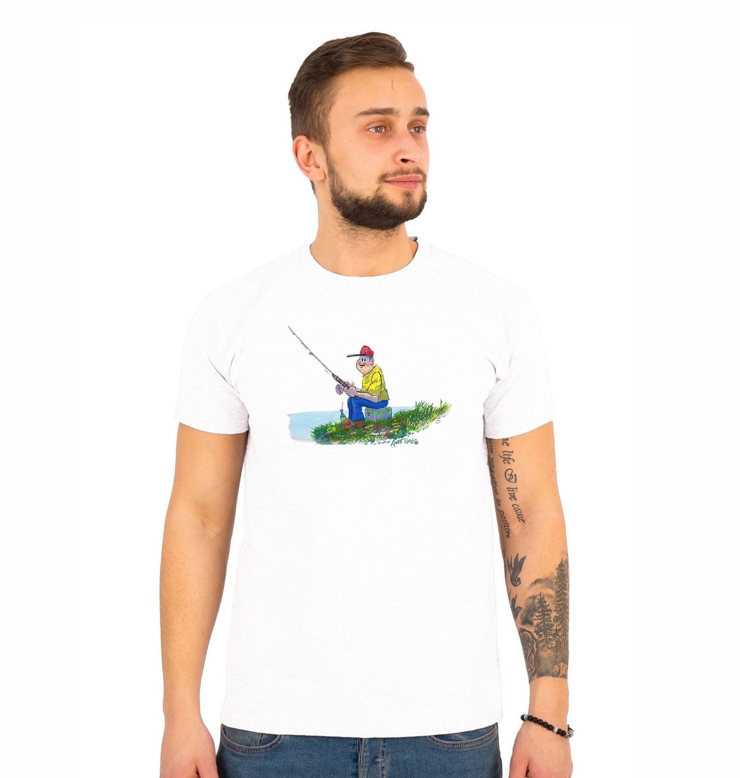 Pánské tričko Rybář u Vody. Lehký, humorný motiv zachycující klidnou chvíli u vody, kde rybář trpělivě čeká na záběr. Ilustrace působí pohodově a připomíná radost z jednoduchých momentů, kdy je rybaření především o klidu, přírodě a odpočinku. Ryba zde symbolizuje cíl i naději každé výpravy.