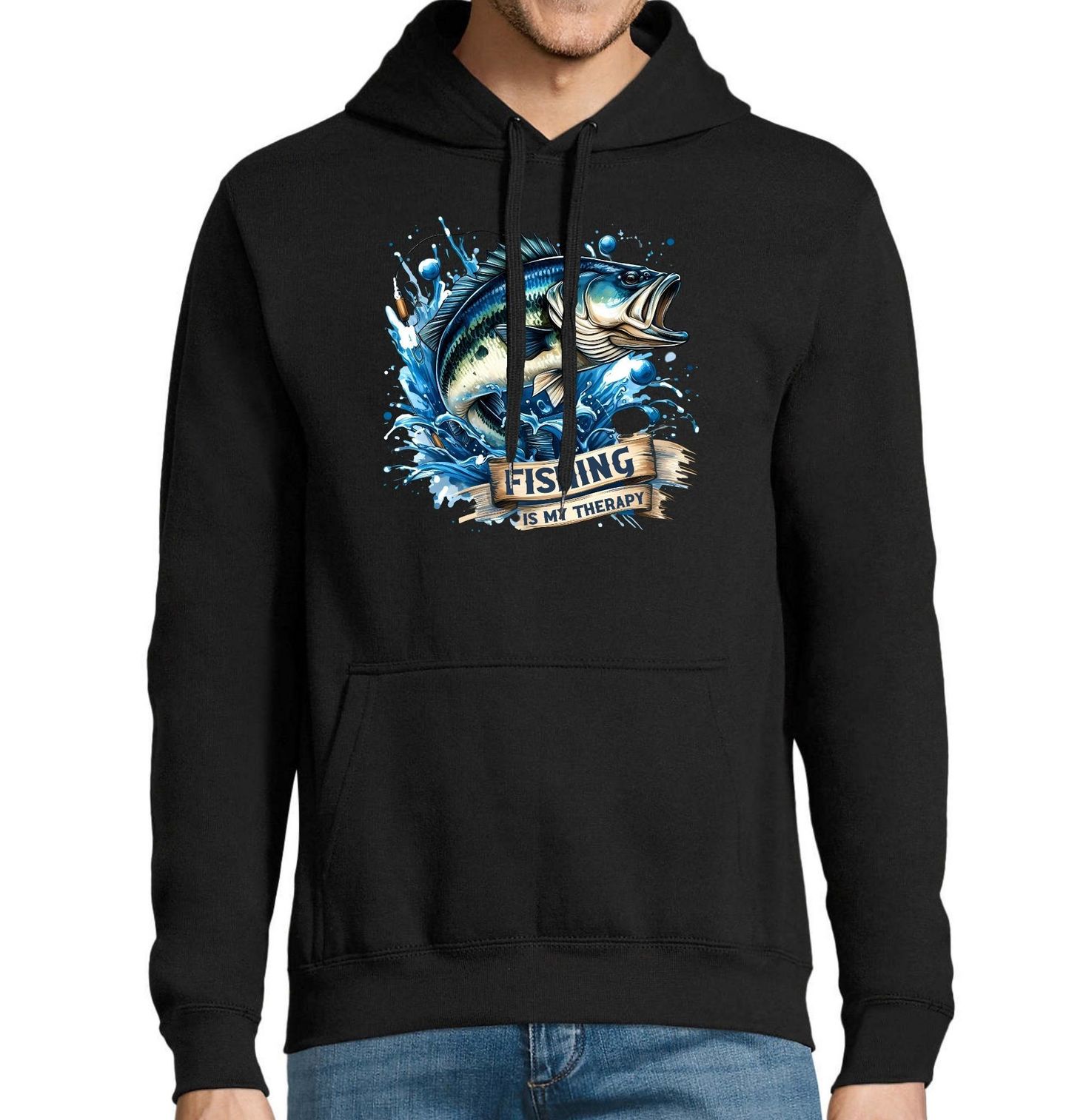 Pánská mikina Rybaření je moje terapie Fishing is my Therapy. Pro všechny vášnivé rybáře, kteří nacházejí klid a štěstí u vody! Tento detailně zpracovaný design s majestátním okounem skákajícím z vody dokonale vystihuje pocit vzrušení a relaxace, který přináší rybolov.