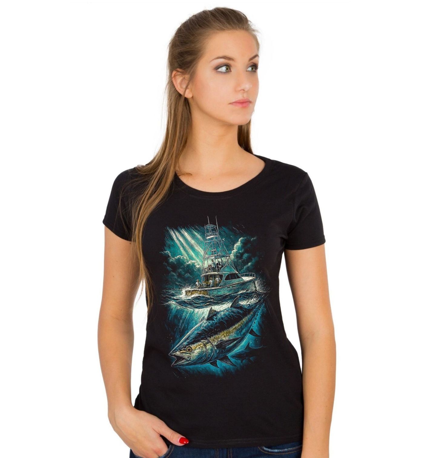 Dámské tričko Rybáři na Lodi. Dynamický motiv zachycuje tuňáka žlutoploutvého (Thunnus albacares), jednoho z nejrychlejších a nejsilnějších mořských predátorů, plujícího těsně pod rybářskou lodí v rozbouřeném oceánu. Kontrast mezi klidnou siluetou posádky a explozivní energií ryby v hlubinách dokonale vystihuje napětí, které rybaření na otevřeném moři přináší.