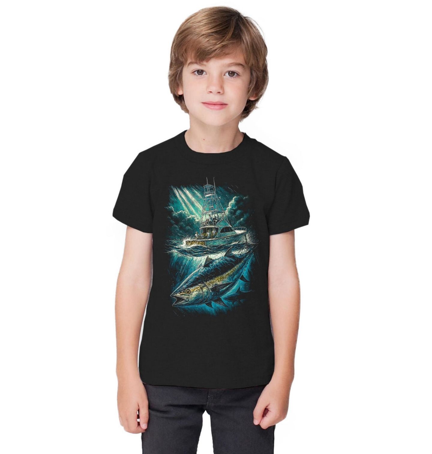 Dětské tričko Rybáři na Lodi. Dynamický motiv zachycuje tuňáka žlutoploutvého (Thunnus albacares), jednoho z nejrychlejších a nejsilnějších mořských predátorů, plujícího těsně pod rybářskou lodí v rozbouřeném oceánu. Kontrast mezi klidnou siluetou posádky a explozivní energií ryby v hlubinách dokonale vystihuje napětí, které rybaření na otevřeném moři přináší.