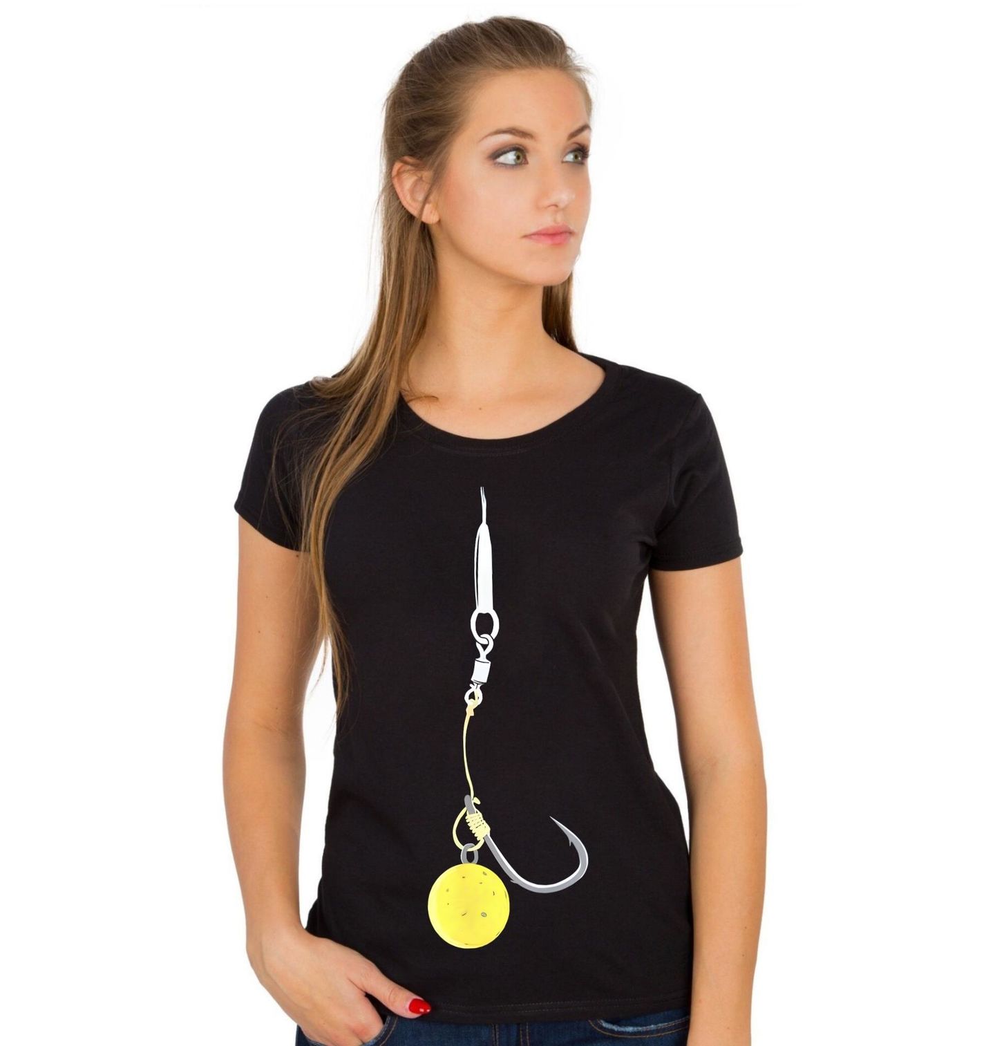 Dámské tričko Rybářský Háček s Návdanou. Minimalistický motiv zobrazuje rybářský háček s nástrahou (boilie), připravený na úspěšný lov. Tento design je ideální pro vášnivé rybáře a milovníky rybaření. Detailní zpracování montáže dodává obrázku realistický vzhled. Motiv s klíčovým slovem rybářský háček skvěle vystihuje atmosféru rybaření a čekání na velký úlovek.