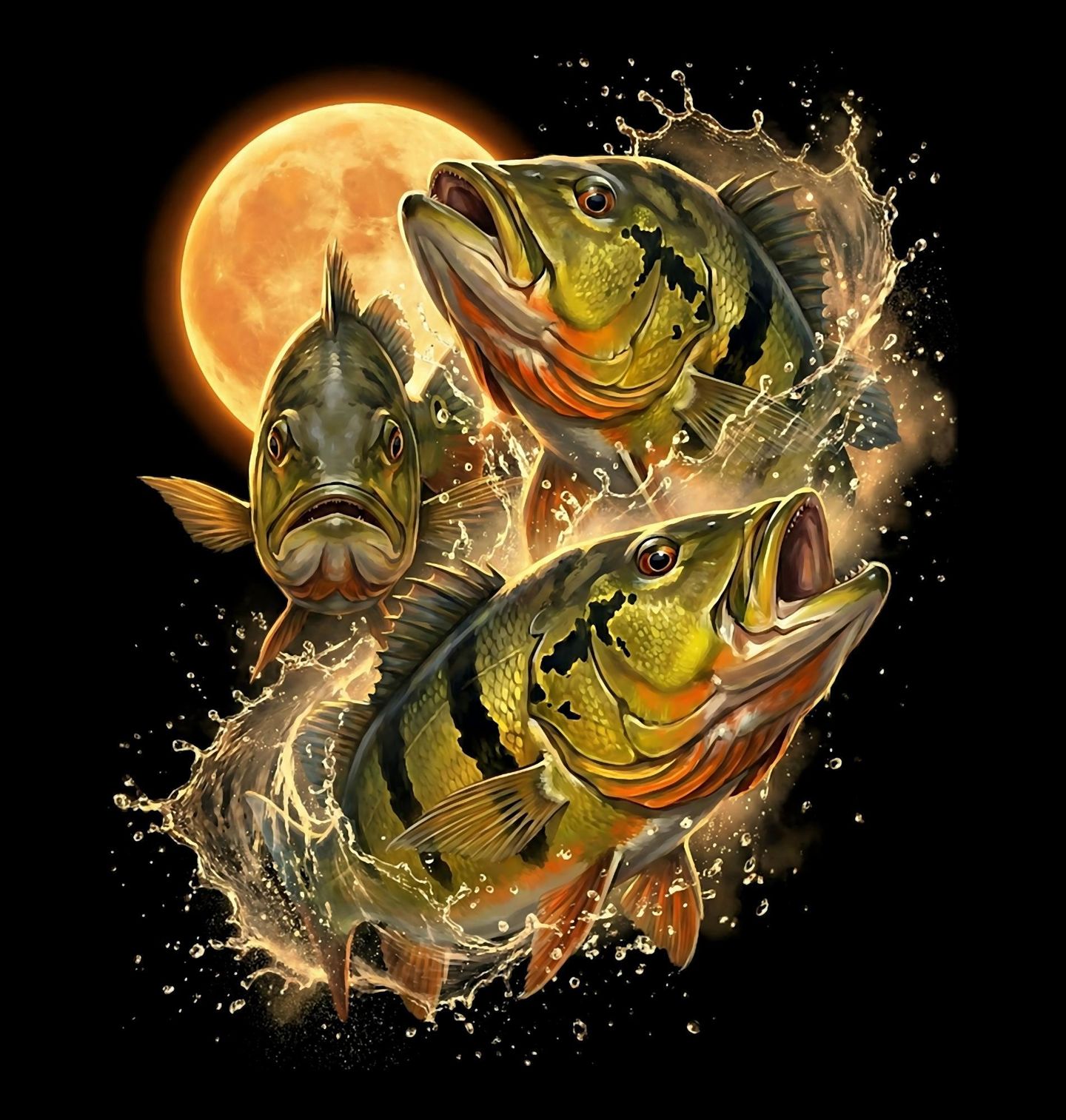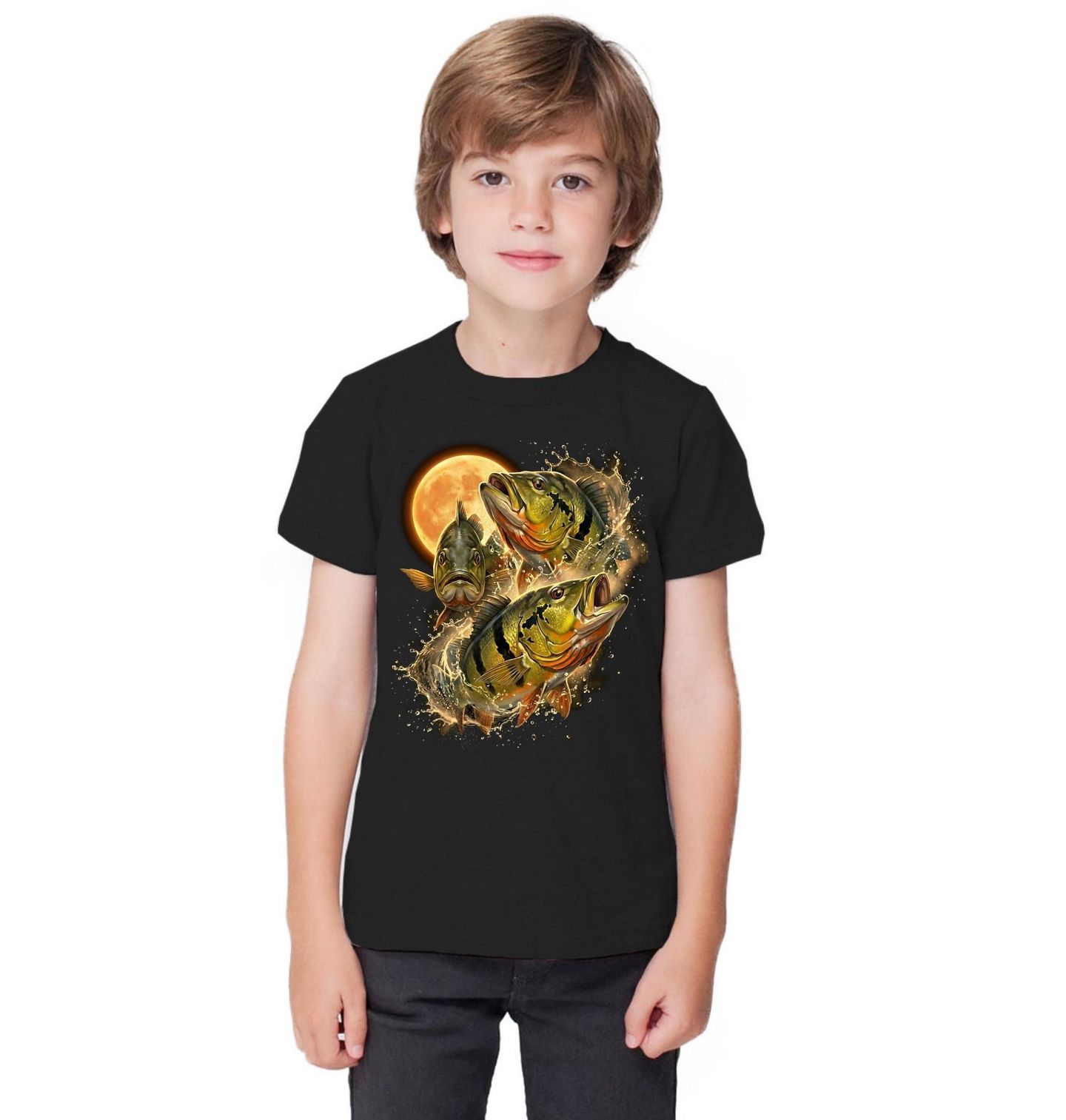 Dětské tričko Ryby při Úplňku. Dynamický motiv zobrazuje tři ryby, které vyskakují z vody přímo před zářícím úplňkem. Kapky vody a dramatické světlo vytvářejí energickou scénu plnou pohybu. Tento design je ideální pro rybáře a milovníky přírody, kteří si užívají klid nočního rybolovu okounů.