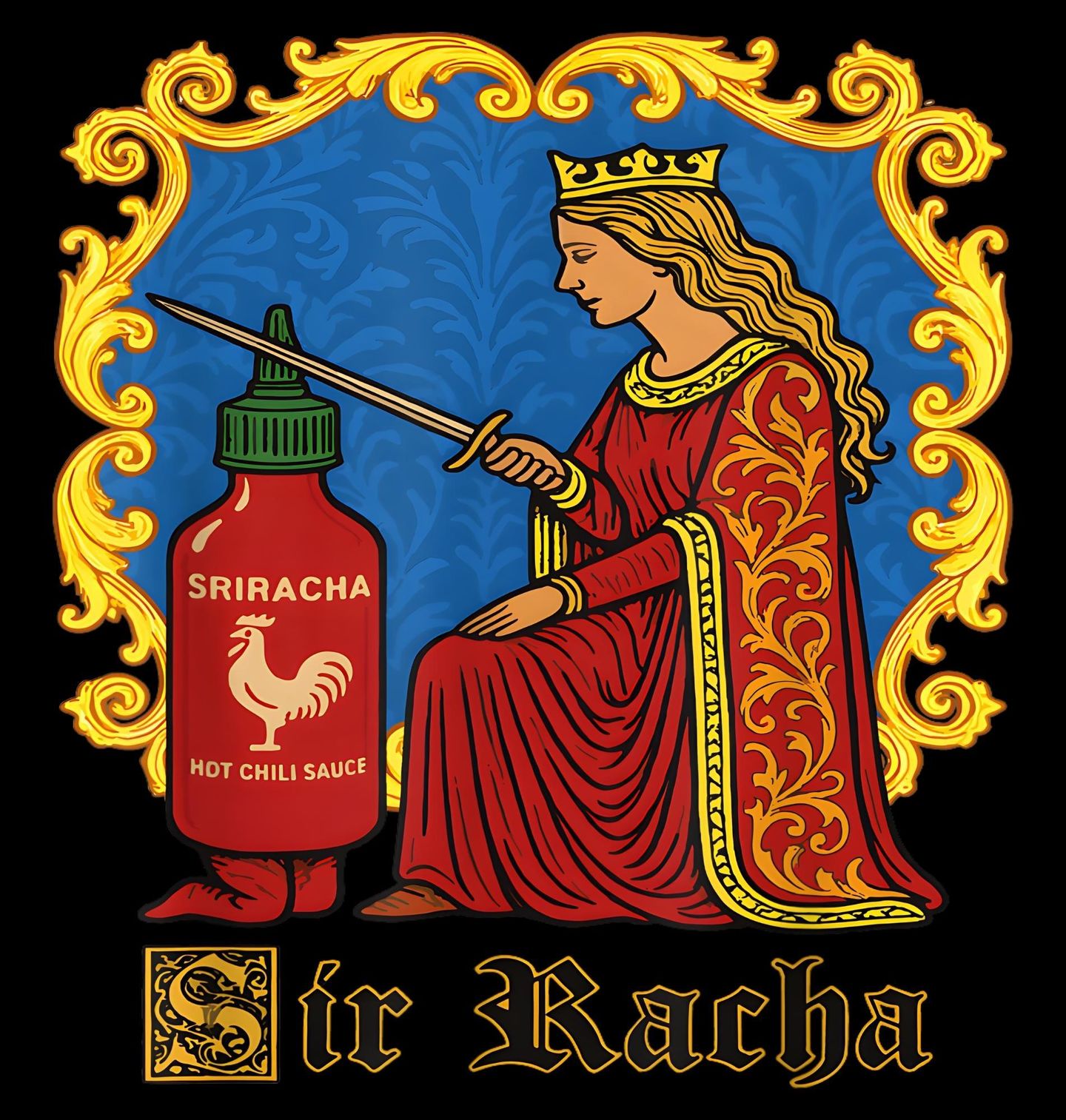 Dámské tričko Rytíř Omáčky Sir Racha. „Sir Racha“ je vtipná parodie na legendárního Sira Lancelota z artušovských příběhů. Královská pocta nejpálivější legendě – tenhle motiv je vtipná parodie na rytířské pasování, kde hlavní roli nehraje meč, ale slavná pálivá omáčka Sriracha.