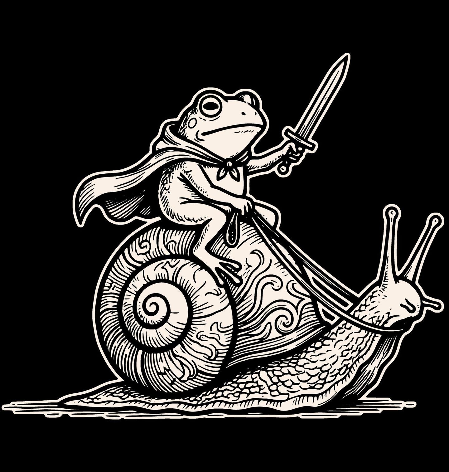 Dětské tričko Rytířská Žába na Šnekovi. Ilustrace zachycuje odhodlanou postavu, kterou je žába, jedoucí na svém neobvyklém oři – tím je pomalý, ale vytrvalý šnek. Meč v ruce a plášť ve větru dodávají celé scéně epický nádech, zatímco kontrast mezi rychlostí a realitou vytváří úsměvný efekt. Detailní kresba a výrazný styl zaujmou každého milovníka ilustrací, fantasy světa i originálních motivů.