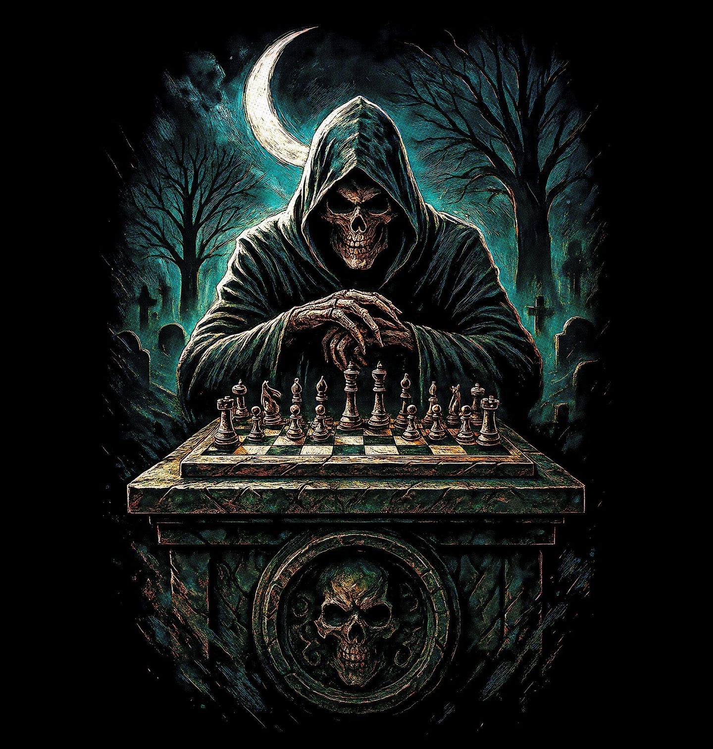 Dámské tričko Šachová Partie se Smrtkou. Objevte jedinečný motiv, kde se snoubí tajemná atmosféra a symbolika strategie. Tento originální design zachycuje kostlivec zahalený v temnotě, který soustředěně rozehrává šachy uprostřed ponurého prostředí, jakým je hřbitov. Kombinace mystiky, napětí a intelektuální hry vytváří silný vizuální zážitek, který zaujme každého milovníka temné estetiky.
