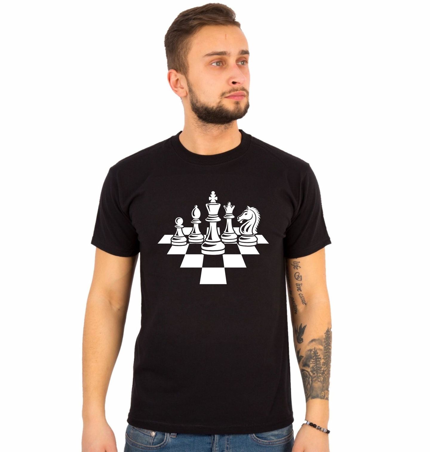 Pánské tričko Šachové Figurky Královský tah. Na černém pozadí vyniká bílá silueta krále, královny, koně, věže, střelce i pěšce – dokonalá reprezentace každého šachisty a jeho vášní. Perfektní volba pro hráče, fanoušky i milovníky logiky a preciznosti. Šachy nejsou jen hra – jsou umění, boj a životní filozofie.