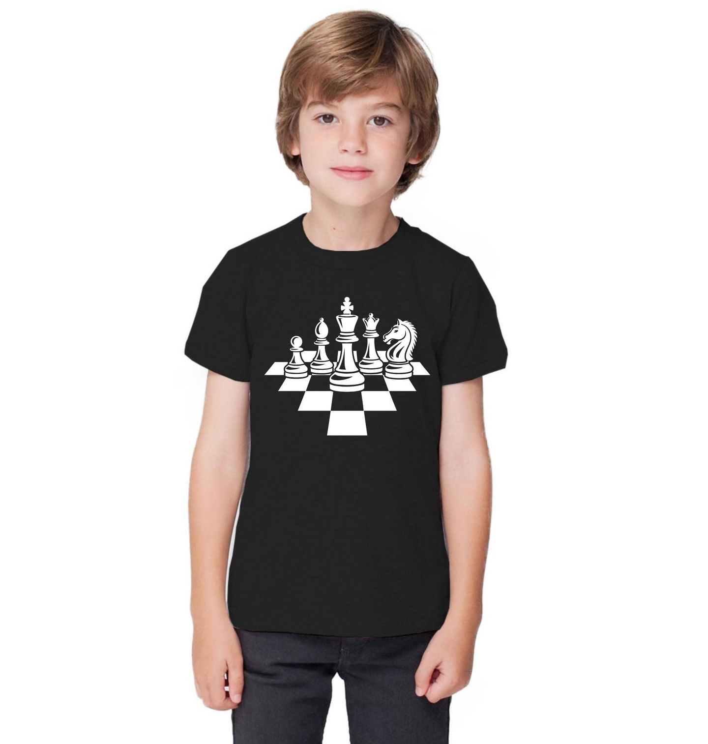 Dětské tričko Šachové Figurky Královský tah. Na černém pozadí vyniká bílá silueta krále, královny, koně, věže, střelce i pěšce – dokonalá reprezentace každého šachisty a jeho vášní. Perfektní volba pro hráče, fanoušky i milovníky logiky a preciznosti. Šachy nejsou jen hra – jsou umění, boj a životní filozofie.
