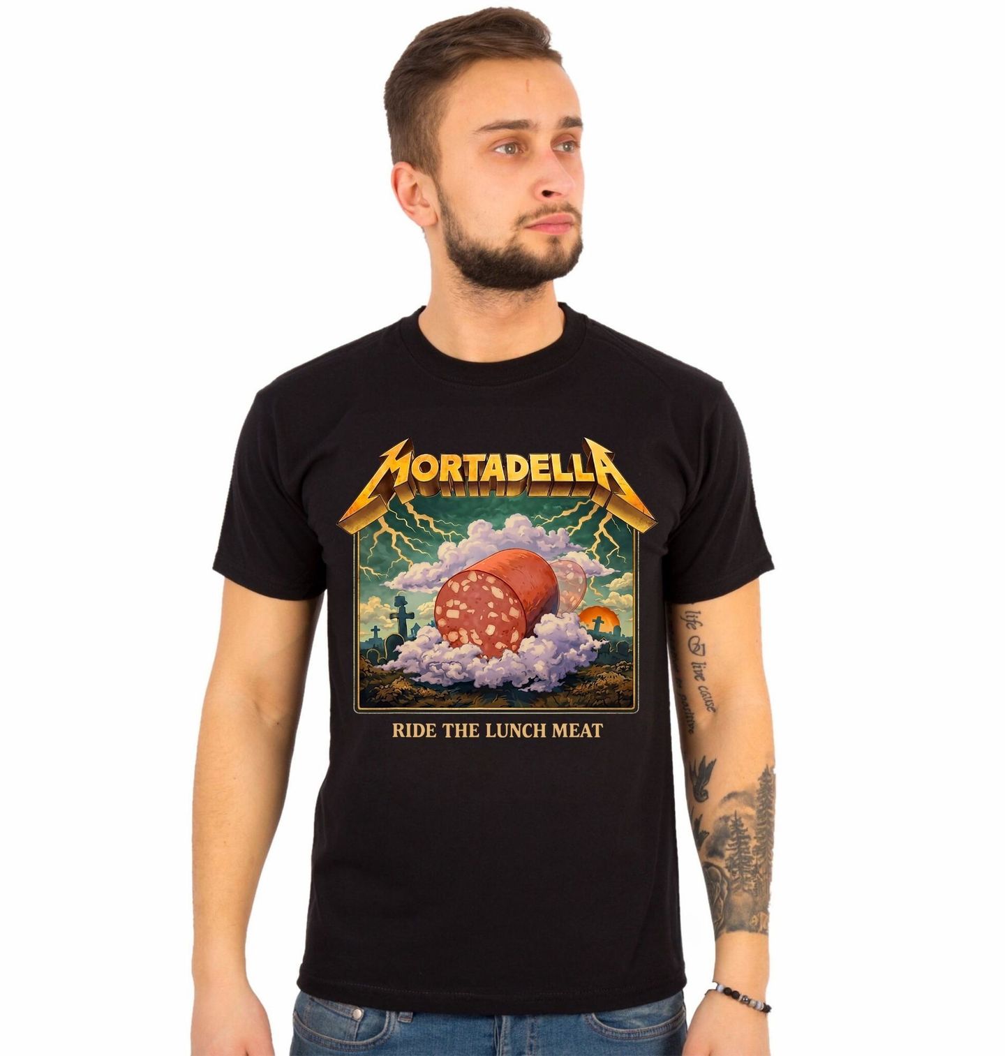 Pánské tričko Salám Mortadela Ride the Lunch Meat. Naskoč na obědové maso. Tenhle jedinečný motiv spojuje tvrdý metal styl s pořádnou dávkou absurdního humoru. Obří salám dopadá do apokalyptické scény plné blesků, hřbitova a chaosu – jako by šlo o obal legendárního metalového alba.