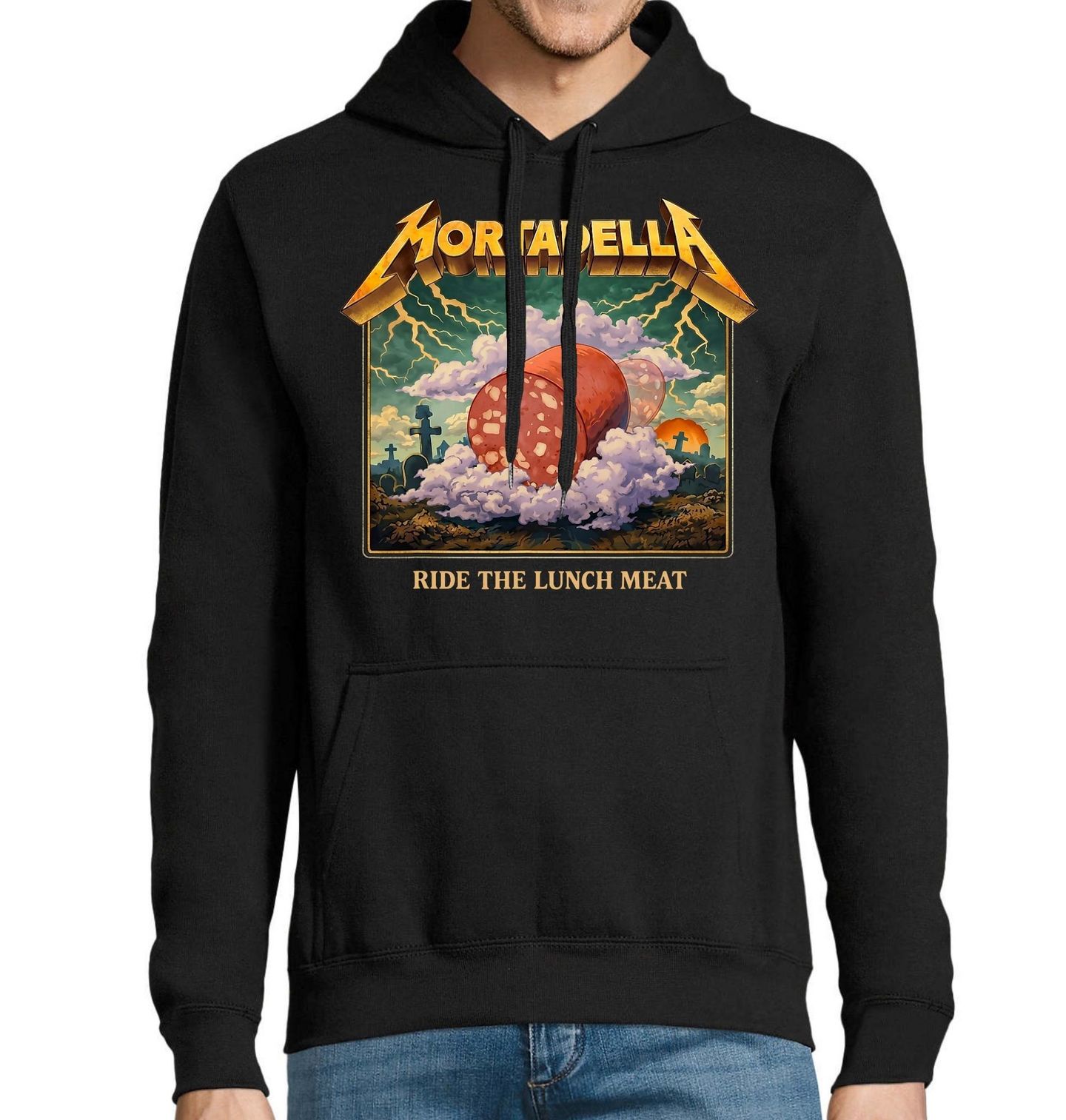 Pánská mikina Salám Mortadela Ride the Lunch Meat. Naskoč na obědové maso. Tenhle jedinečný motiv spojuje tvrdý metal styl s pořádnou dávkou absurdního humoru. Obří salám dopadá do apokalyptické scény plné blesků, hřbitova a chaosu – jako by šlo o obal legendárního metalového alba.