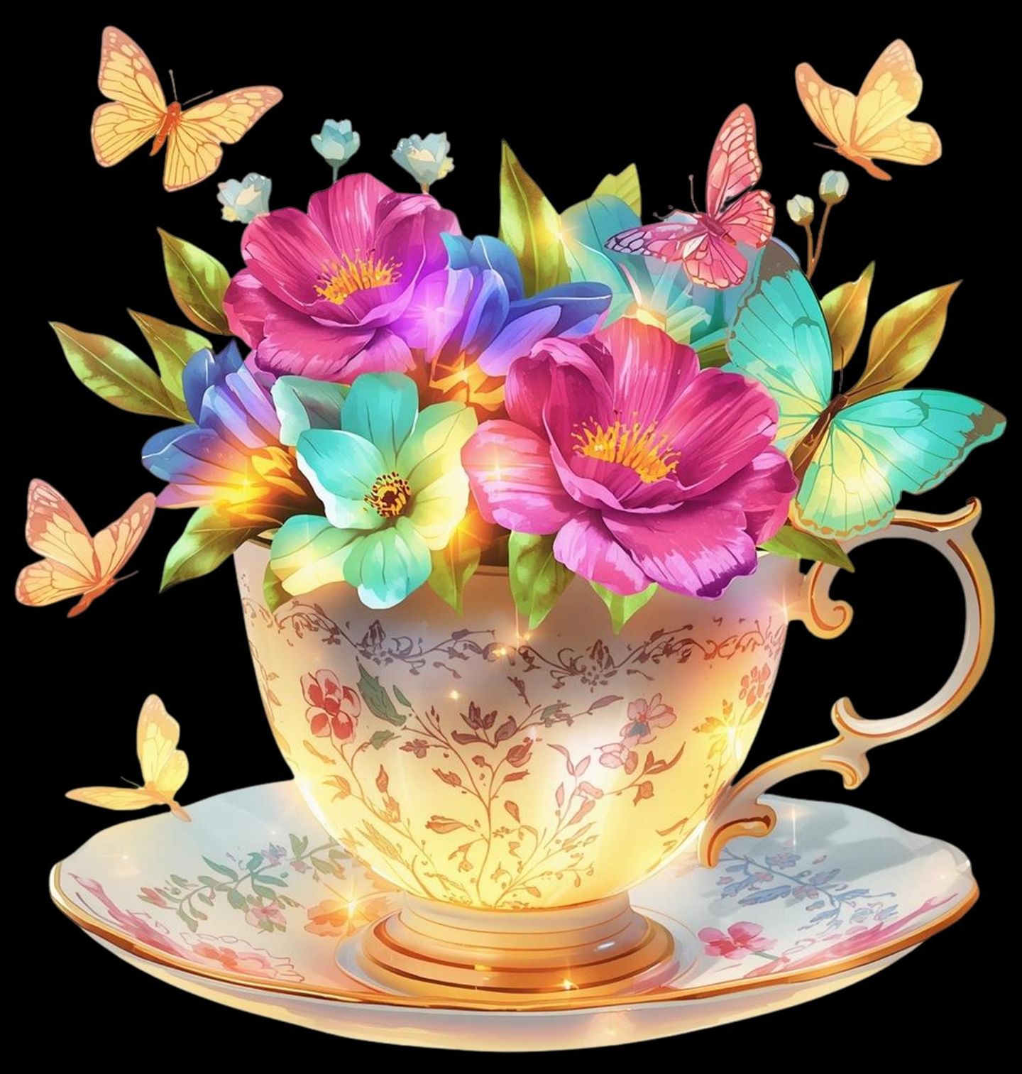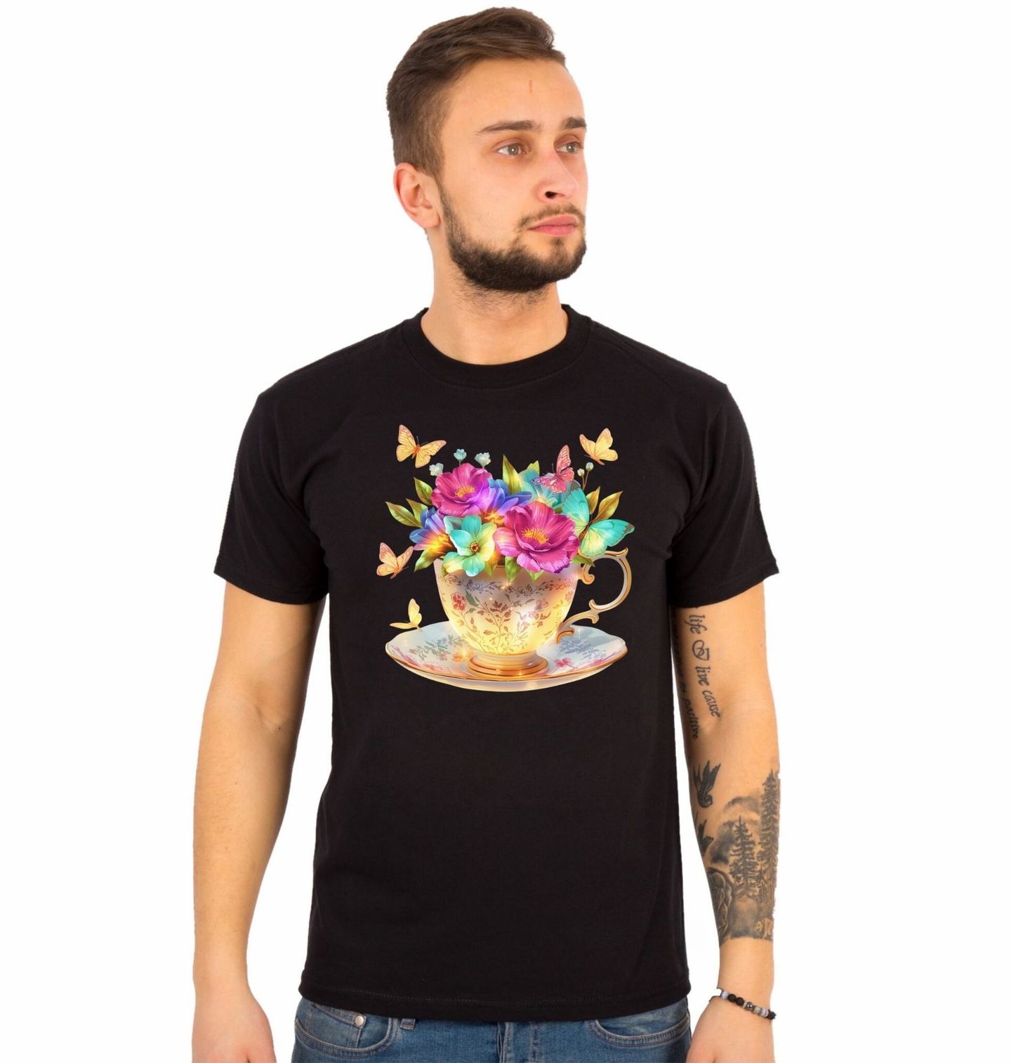 Pánské tričko Šálek Květinového Čaje. Detailně zpracovaný šálek s dekorativním vzorem dodává motivu nádech vintage stylu, zatímco pestré květiny a jemní motýli přinášejí lehkost a radost. Celý design působí jako ilustrace plná světla a fantazie, která rozzáří každý produkt. Květiny zde symbolizují krásu, růst a radost, zatímco šálek představuje chvíli klidu a potěšení.
