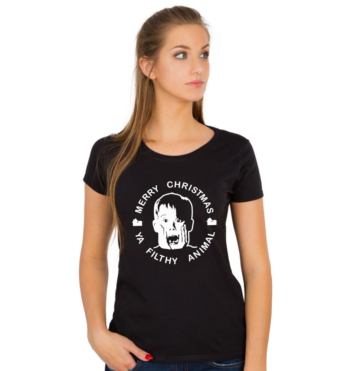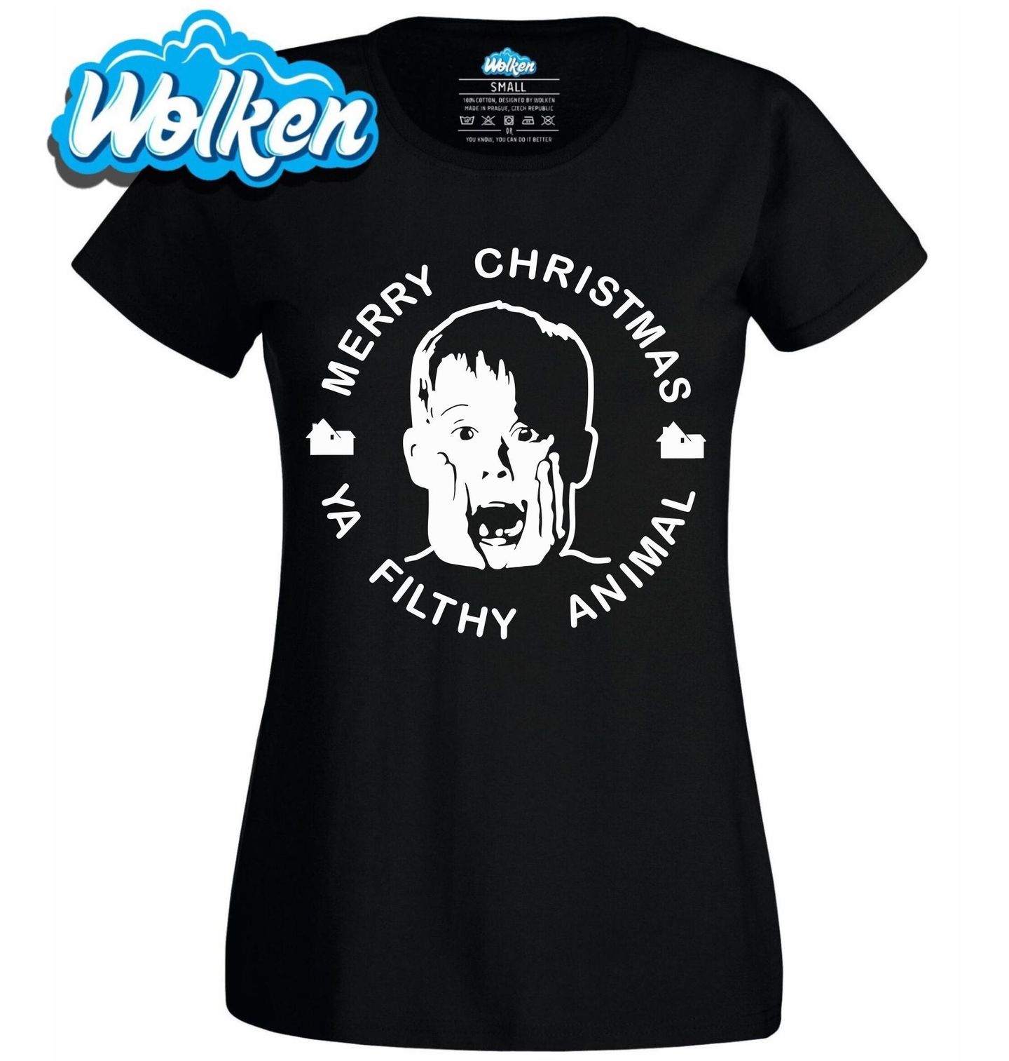 Dámské tričko Sám doma na Vánoce. Tento ikonický motiv je must-have pro každého fanouška filmové klasiky! Silueta malého Kevina a hláška „Merry Christmas, ya filthy animal“ (česky: „Veselé Vánoce, ty špinavé zvíře“) okamžitě navodí nostalgickou atmosféru rodinného filmu Sám doma – a přesně o tom jsou ty pravé Vánoce.