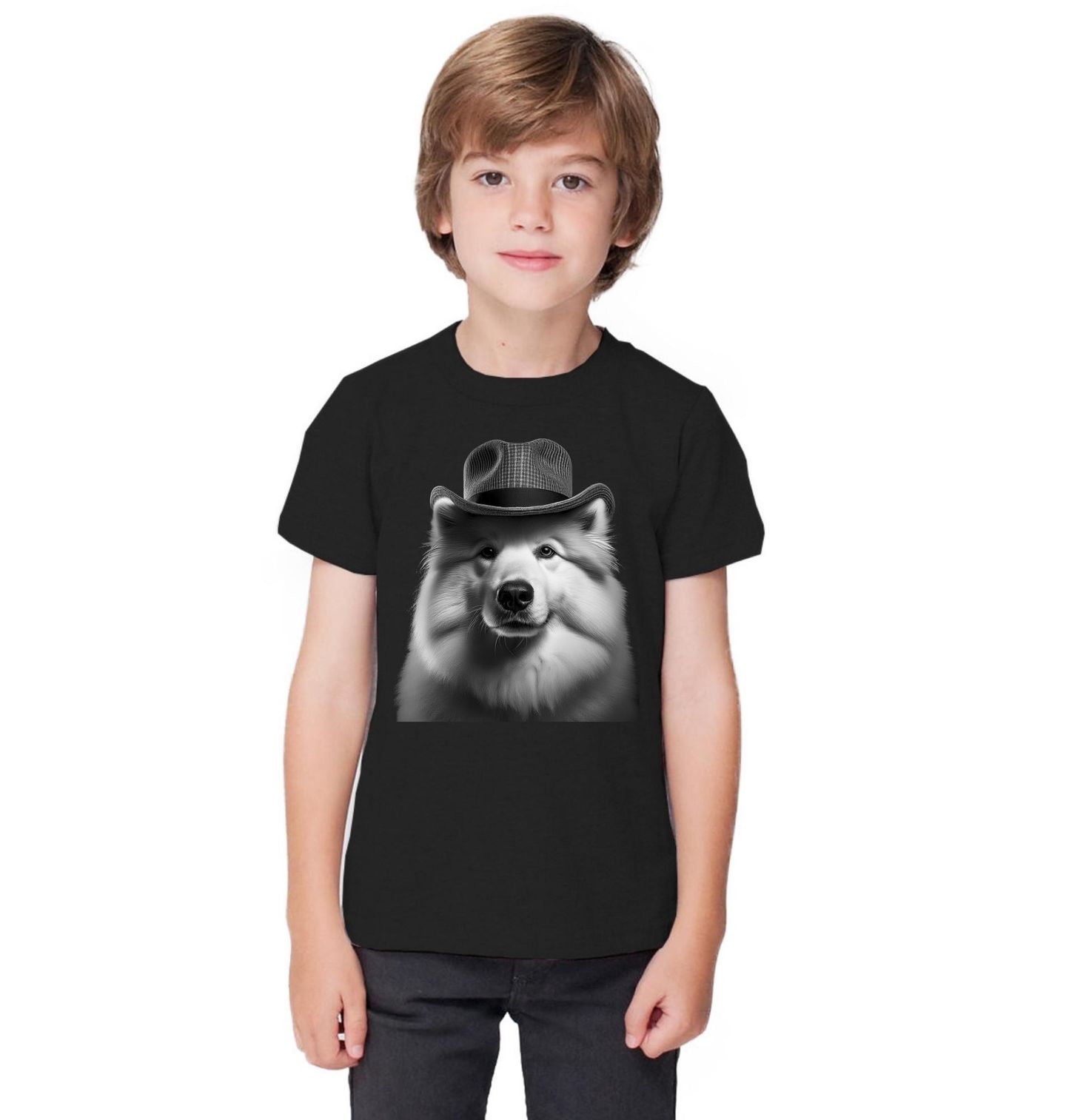 Dětské tričko Samojed s Kloboukem. Stylový motiv zachycuje plemeno samojed jako noblesní pes s kloboukem, který vyzařuje eleganci, klid a přirozené charisma. Samojed je známý svou hustou bílou srstí, přátelskou povahou a typickým „úsměvem“, díky kterému si získá srdce každého milovníka psů. Tento design je ideální pro každého, kdo je hrdý pejskař a chce ukázat svou lásku k plemeni samojed originálním způsobem.