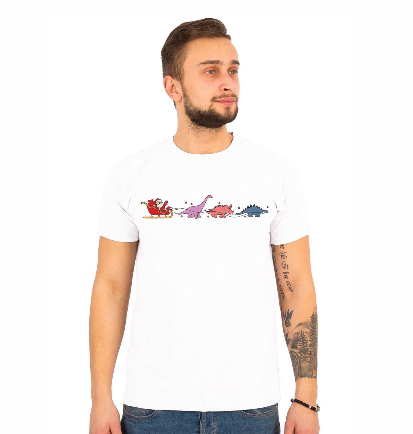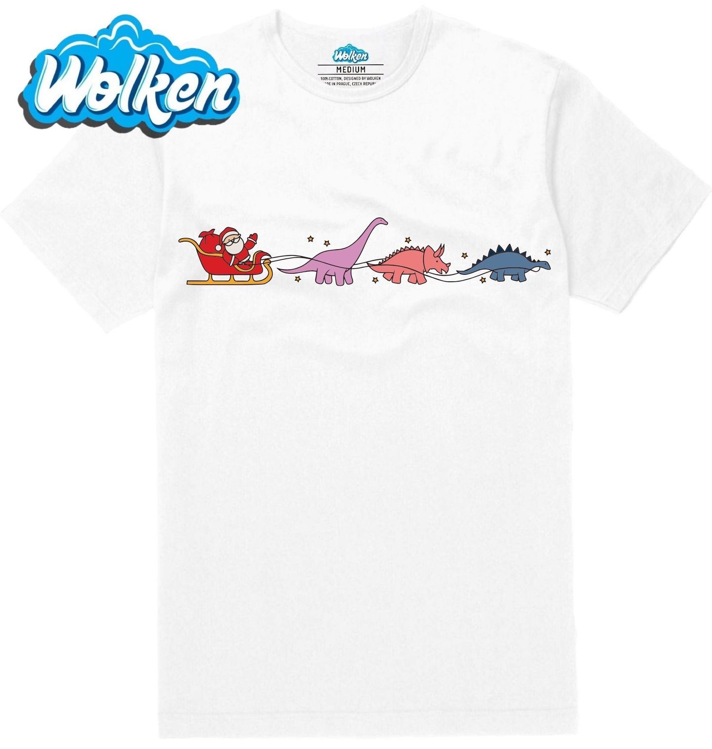 Pánské tričko Santa a Dinosauří Spřežení. Vánoce nikdy nebyly tak prehistoricky zábavné! Santa letos zapřáhl místo sobů roztomilé dinosaury a vyrazil rozdávat dárky po celém pravěkém světě. Modrý dinosaurus je Stegosaurus, červený Triceratops a fialový Brachiosaurus.