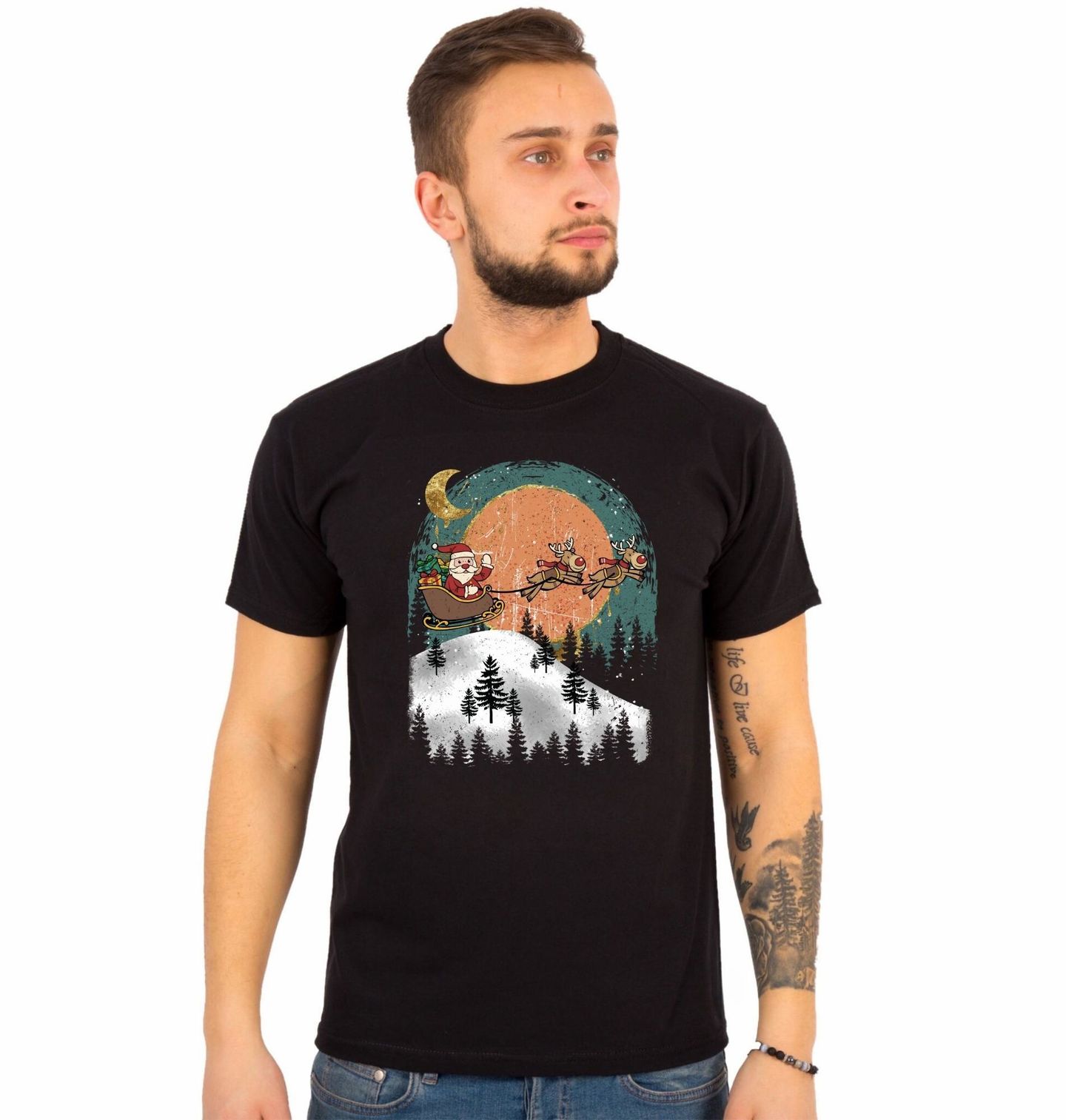 Pánské tričko Santa a Sobí Spřežení. Vneste Vánoce do každého dne s tímto poetickým motivem! Design zachycuje Santu Clause, jak letí na saních tažených dvěma soby přes zasněženou krajinu, noční oblohu a les. V pozadí svítí měsíc a hvězdné nebe ve stylizovaném retro-art provedení.