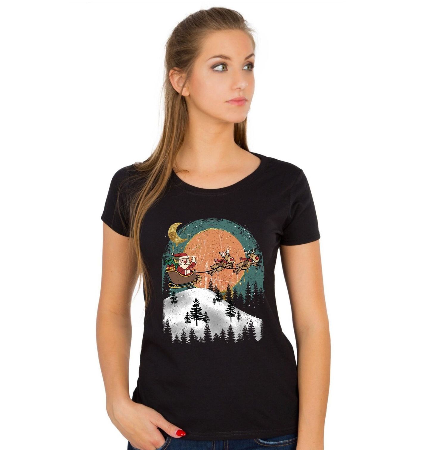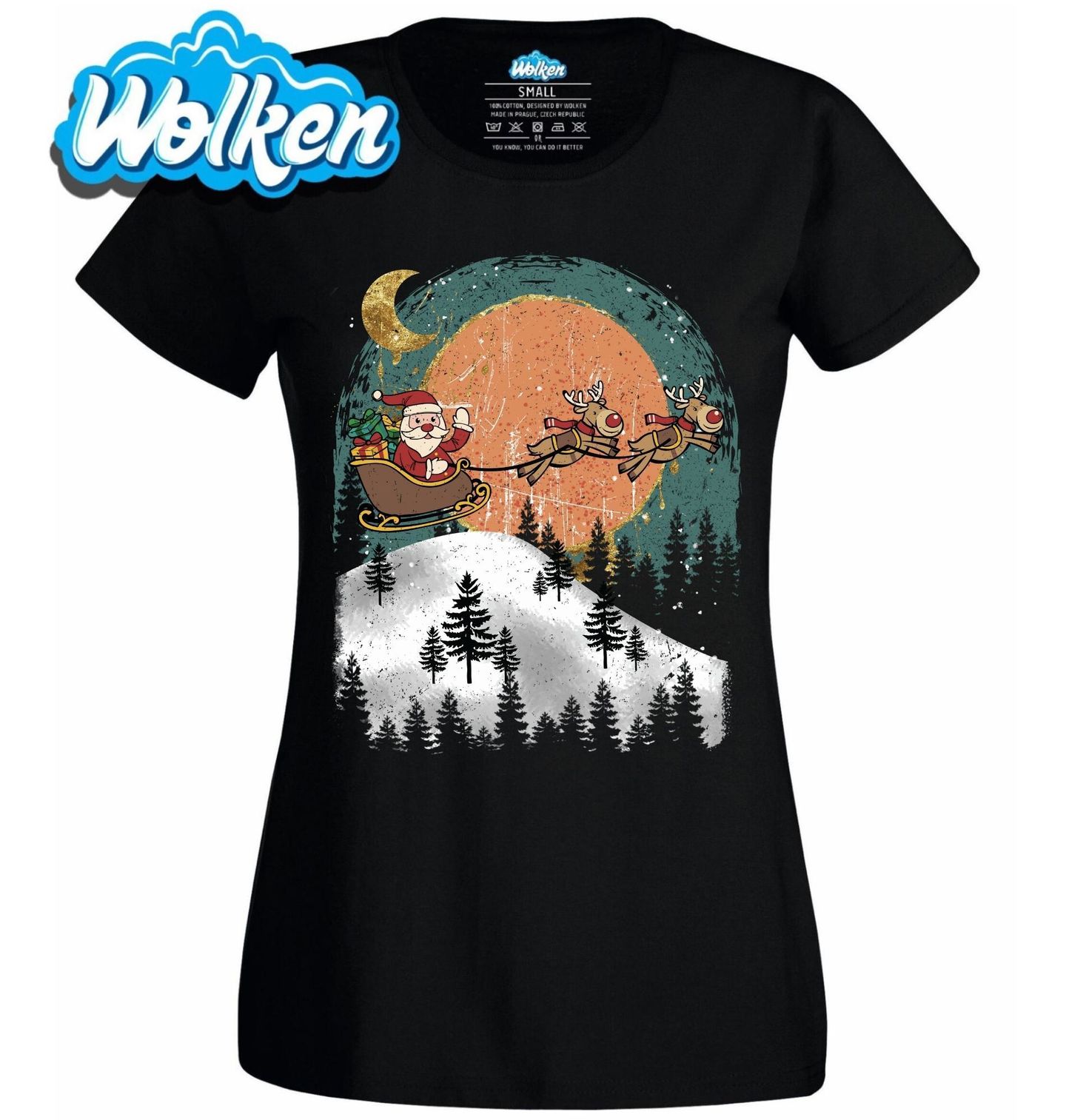 Dámské tričko Santa a Sobí Spřežení. Vneste Vánoce do každého dne s tímto poetickým motivem! Design zachycuje Santu Clause, jak letí na saních tažených dvěma soby přes zasněženou krajinu, noční oblohu a les. V pozadí svítí měsíc a hvězdné nebe ve stylizovaném retro-art provedení.