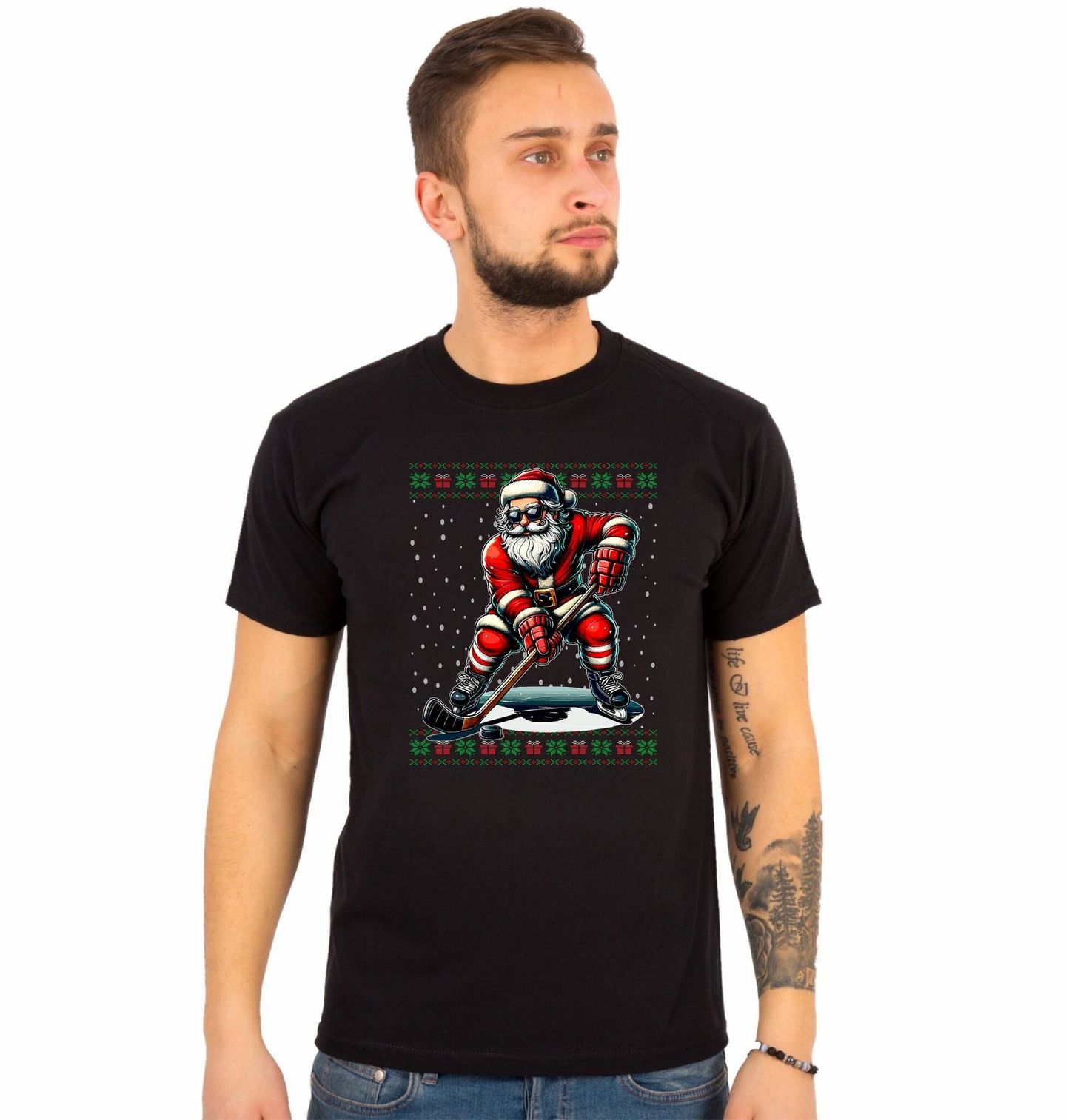 Pánské tričko Santa Hokejista. Když Vánoce potkají ledovou arénu! Tento originální design přináší santy v hokejové výstroji, jak bojuje o puk na ledě. V pozadí nechybí klasický vzor, který připomíná ugly sweater motiv, takže se dokonale hodí na sváteční večírky, hokejové srazy i jako originální dárek.