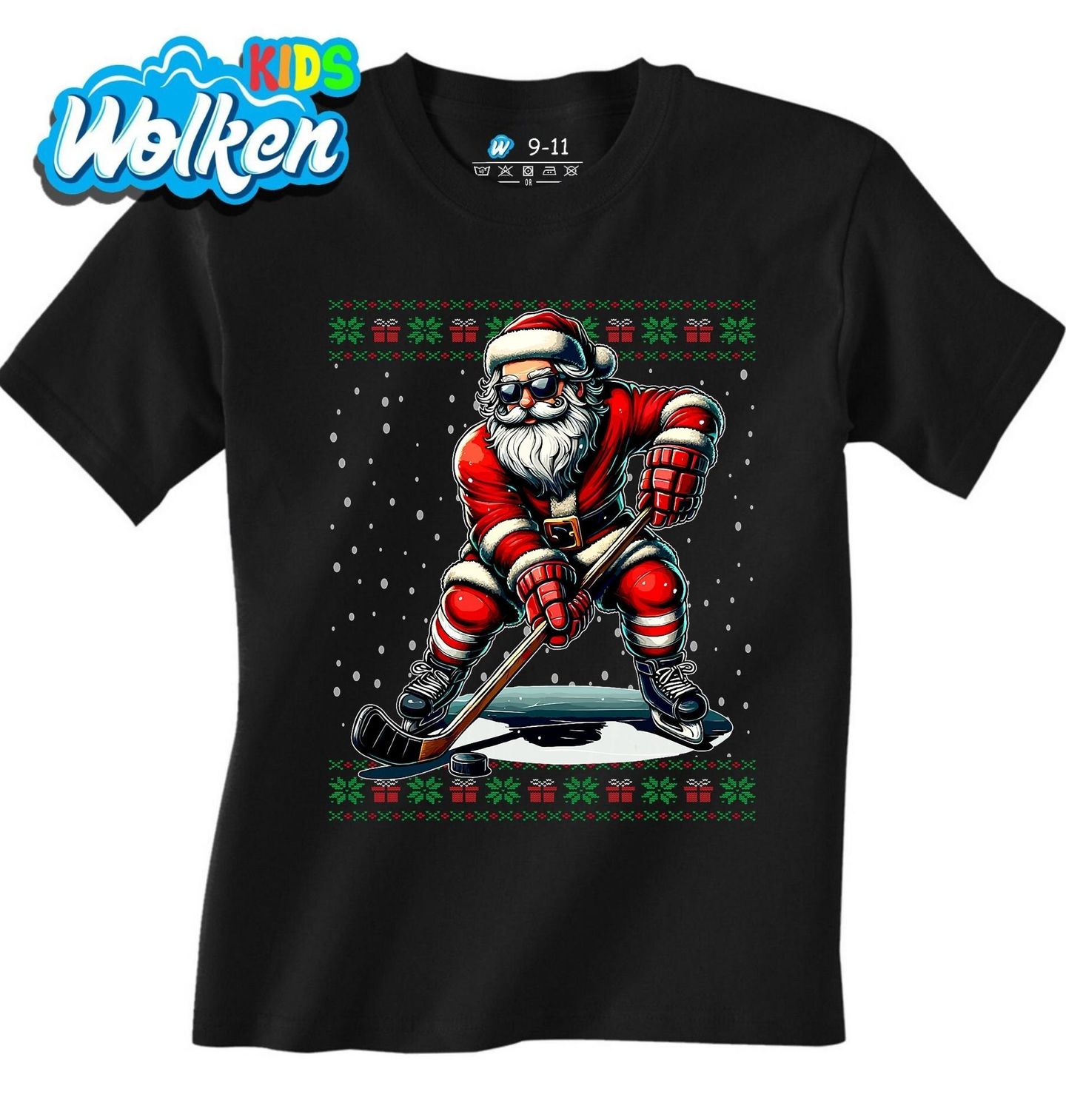 Dětské tričko Santa Hokejista. Když Vánoce potkají ledovou arénu! Tento originální design přináší santy v hokejové výstroji, jak bojuje o puk na ledě. V pozadí nechybí klasický vzor, který připomíná ugly sweater motiv, takže se dokonale hodí na sváteční večírky, hokejové srazy i jako originální dárek.