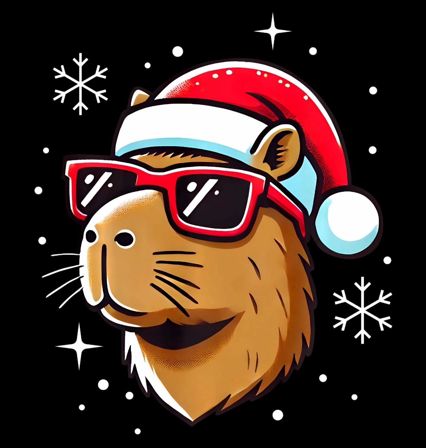 Dámské tričko Santa Kapybara. Ukažte svůj smysl pro humor a originalitu s tímto jedinečným motivem, kde Vánoce slaví největší hlodavec světa – kapybara! Stylová kapybara v Santa čepici a červených brýlích je dokonalou kombinací vánoční pohody a cool atmosféry.