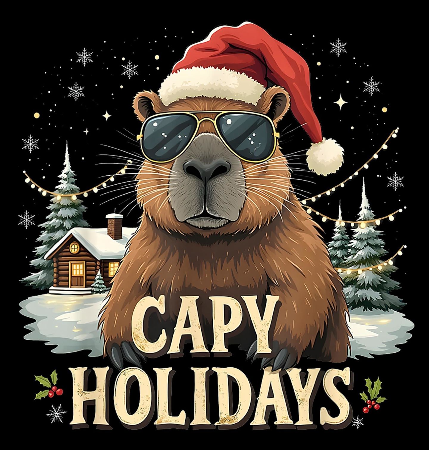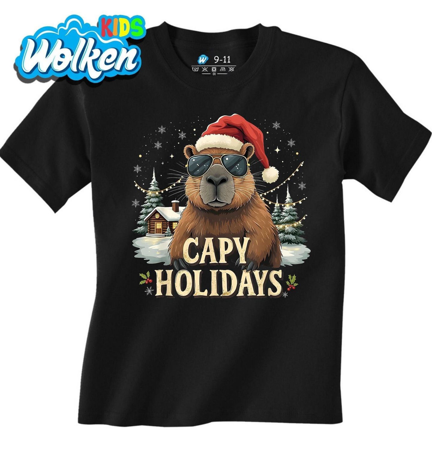 Dětské tričko Santa Kapybara Capy Holidays. Pro milovníky zvířat, kteří chtějí prožít Vánoce jinak – v klidu, pohodě a s kapkou humoru. Tento motiv zachycuje ikonickou kapybaru, největšího hlodavce světa, ve vánoční atmosféře s čepicí, brýlemi a v pozadí zasněžená chata se světýlky.