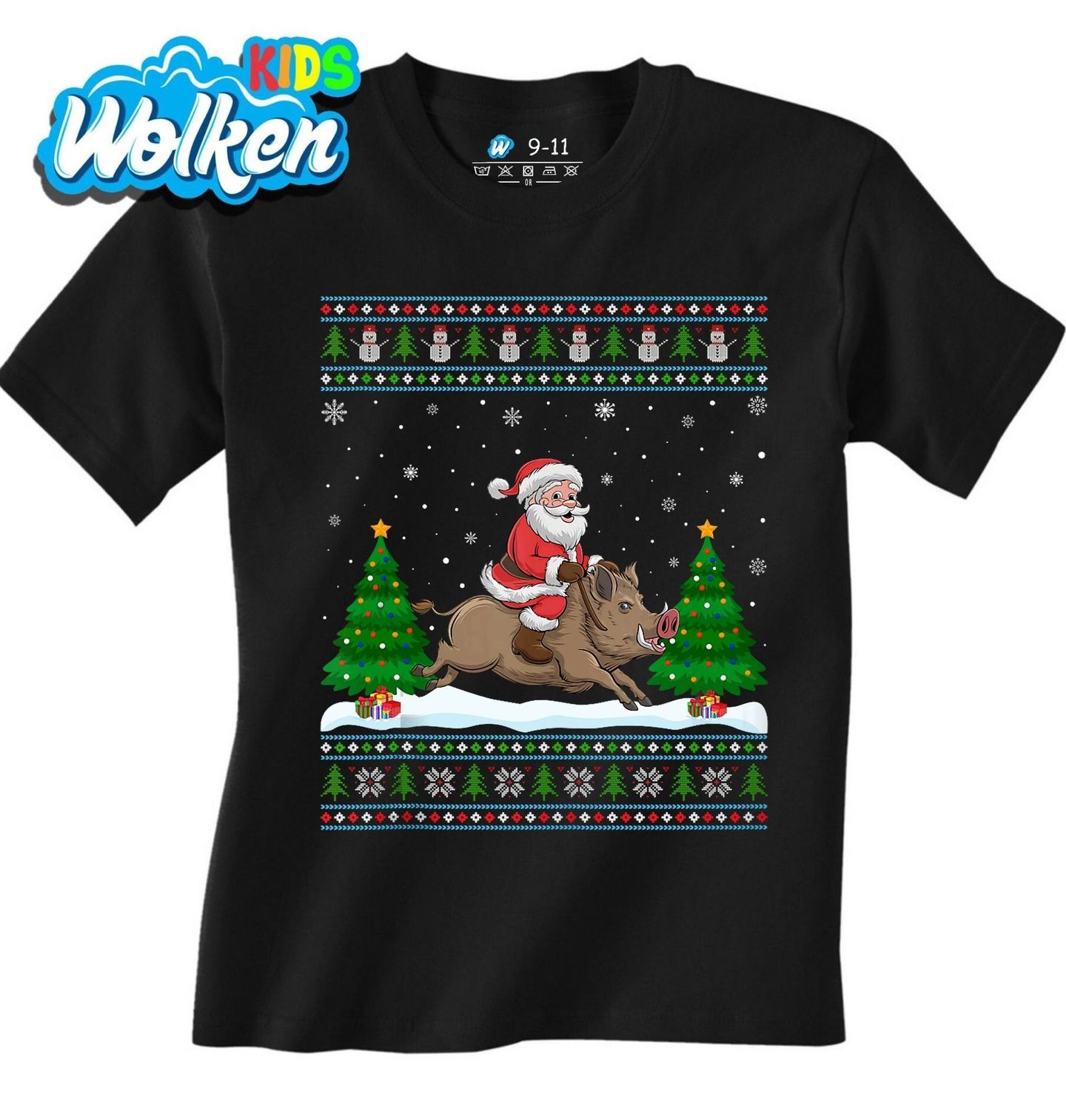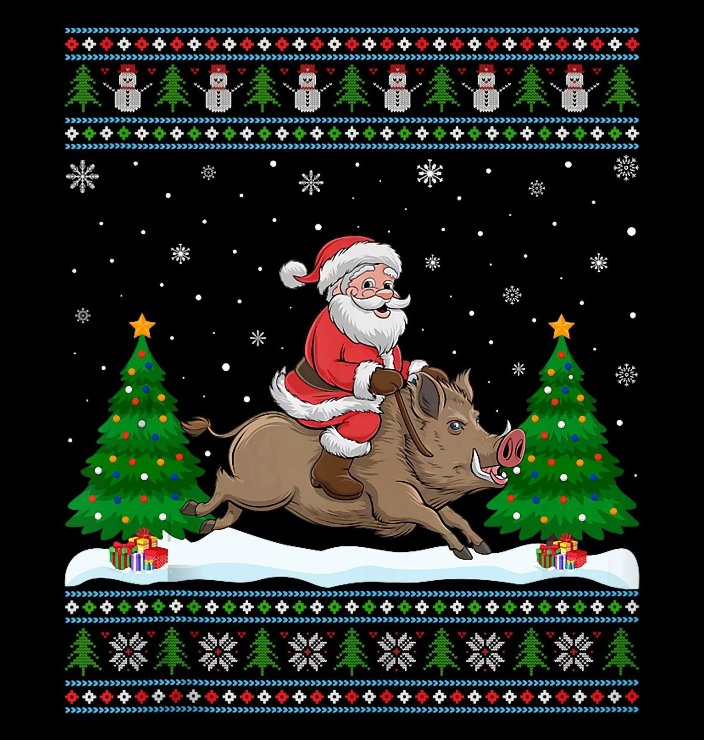 Dětské tričko Santa na Praseti. Když přijdou Vánoce, klasické sáně jdou stranou! Tento veselý a netradiční motiv ukazuje, že santa může vyrazit i jinak – tentokrát sedí na vepři a uhání zimní krajinou mezi ozdobenými stromečky. Celý design je zasazený do stylu ugly sweater, takže působí hravě a svátečně zároveň.