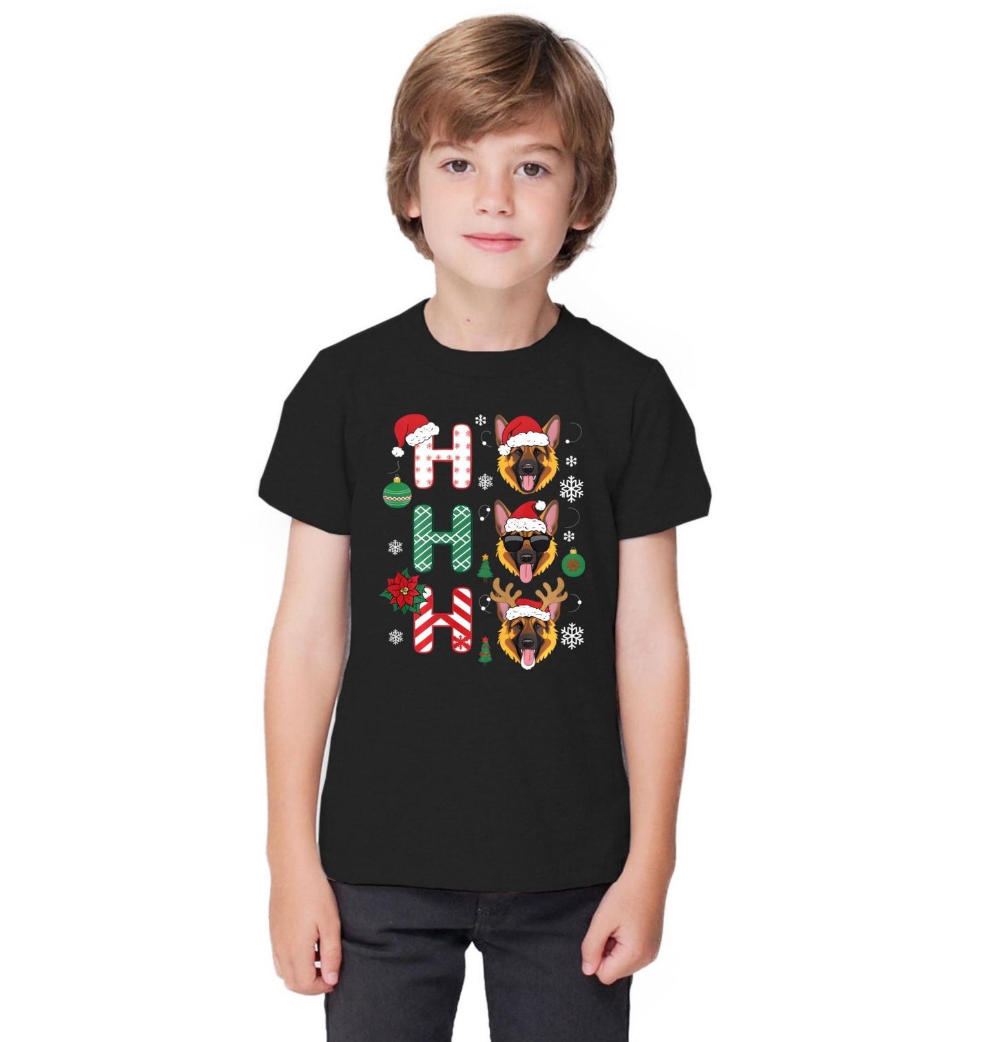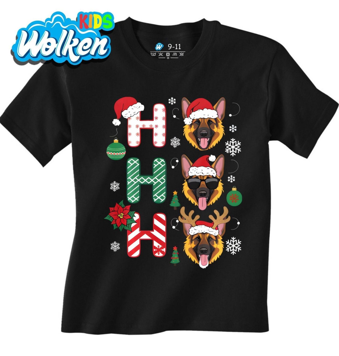 Dětské tričko Santa Německý Ovčák Ho Ho Ho. Udělejte Vánoce ještě veselejšími s tímto motivem, který potěší každého pejskaře! Tři „H“ doplněná veselými německými ovčáky v Santa čepicích, slunečních brýlích a sobích parůžcích přinášejí sváteční náladu i humor. Tento pes rozzáří každé Vánoce.