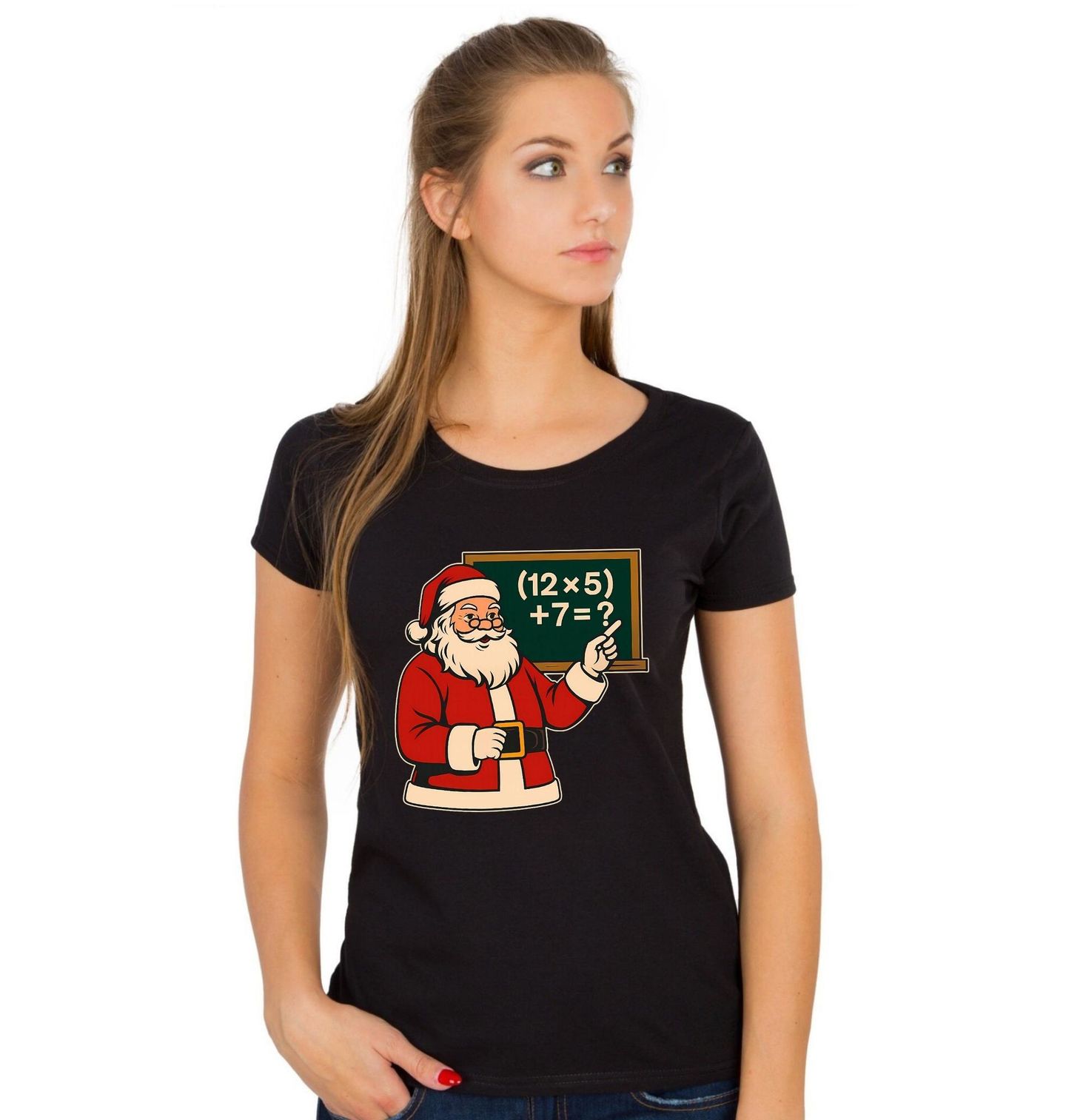 Dámské tričko Santa Učitel Matematiky. Stylový santa v roli přísného učitele matematiky je přesně to pravé! Na tabuli řeší příklad (12 × 5) + 7 = ? – a možná právě počítá, kolik dárků letos rozdá. Ideální design pro všechny učitele, studenty i fanoušky čísel, kteří milují Vánoce a mají smysl pro humor.