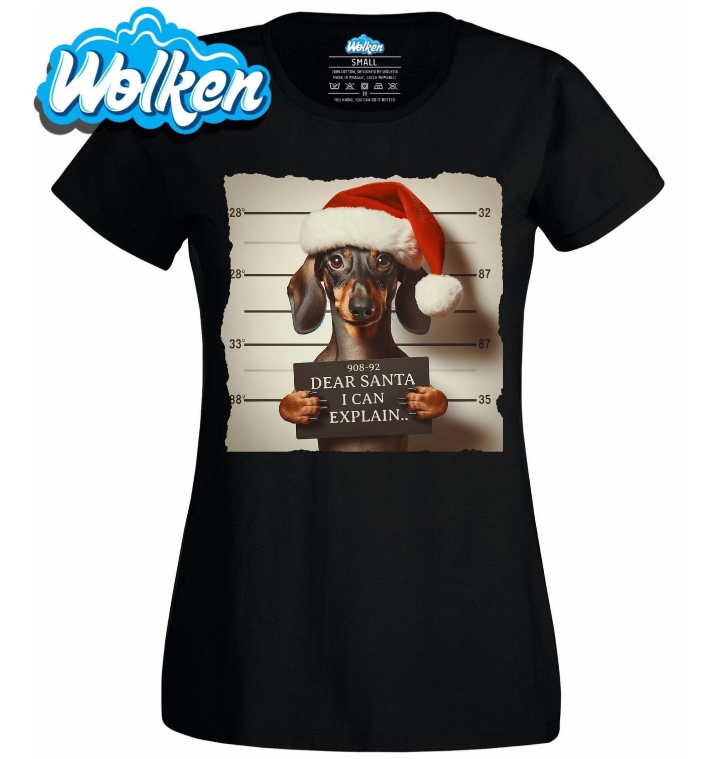 Dámské tričko Santo, já to vysvětlím! Jezevčík Busted. Vánoce mají být veselé – a s tímto vtipným motivem rozhodně budou! Pes jezevčík v mikulášské čepici pózuje jako „busted“ provinilec na policejní tabuli s nápisem „Dear Santa, I can explain…“. Ideální dárek pro každého pejskaře, který miluje humor.
