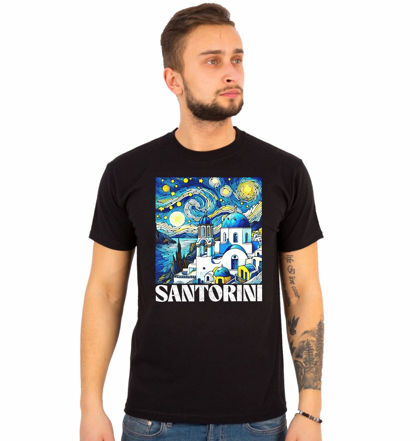 Pánské tričko Santorini v Hvězdné Noci. Umělecký design inspirovaný stylem slavné malby Hvězdné noci zachycuje Santorini pod vířící noční oblohou. Nápis „Santorini“ doplňuje ikonické bílé stavby a modré kopule, které vytvářejí snovou atmosféru. Tento design osloví milovníky cestování, umění i romantických výhledů na moře.