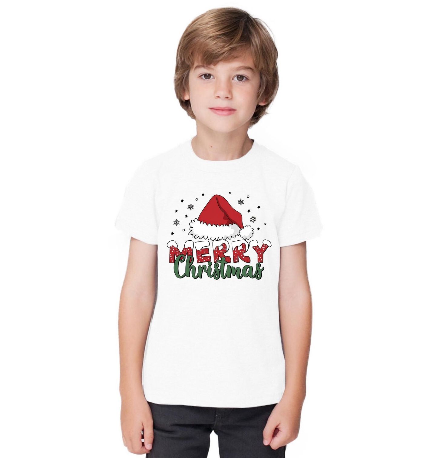 Dětské tričko Santova čepice Merry Christmas. Vneste do svých svátků tu pravou atmosféru – tento veselý motiv s nápisem „Veselé Vánoce“ a typickou santovskou čepicí rozzáří každý vánoční outfit! Ideální pro milovníky tradičních Vánoc s hravým nádechem. Vánoce v plné parádě – stylové, vtipné a přitom nadčasové.